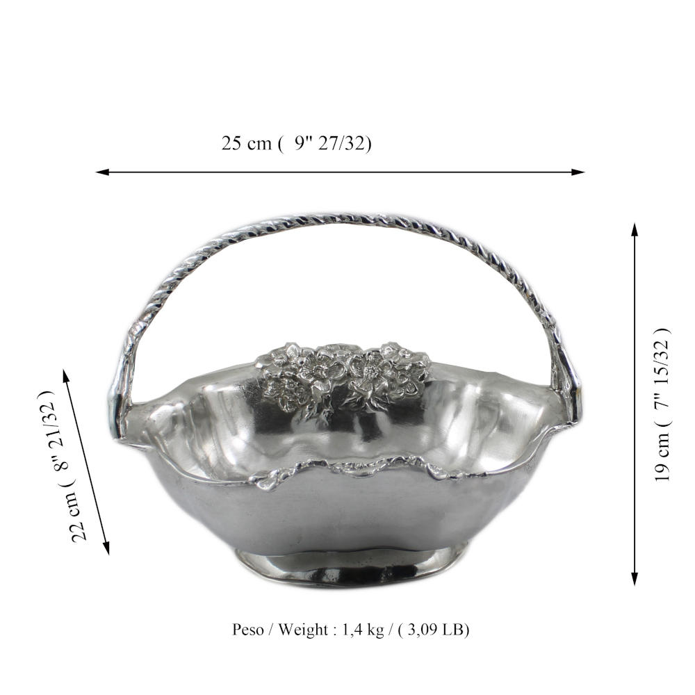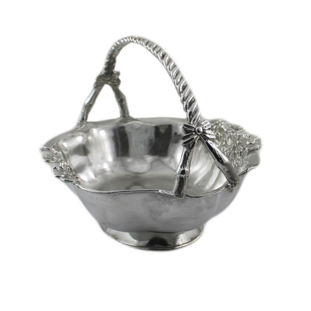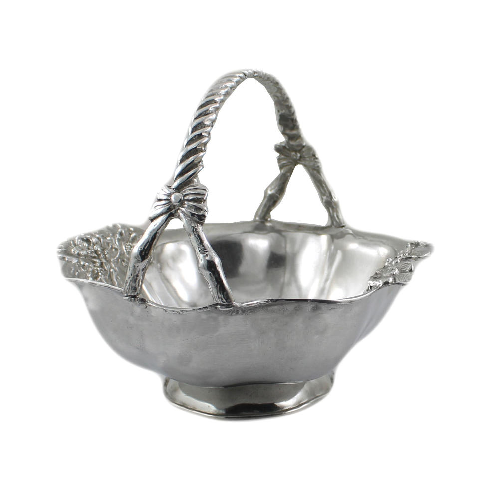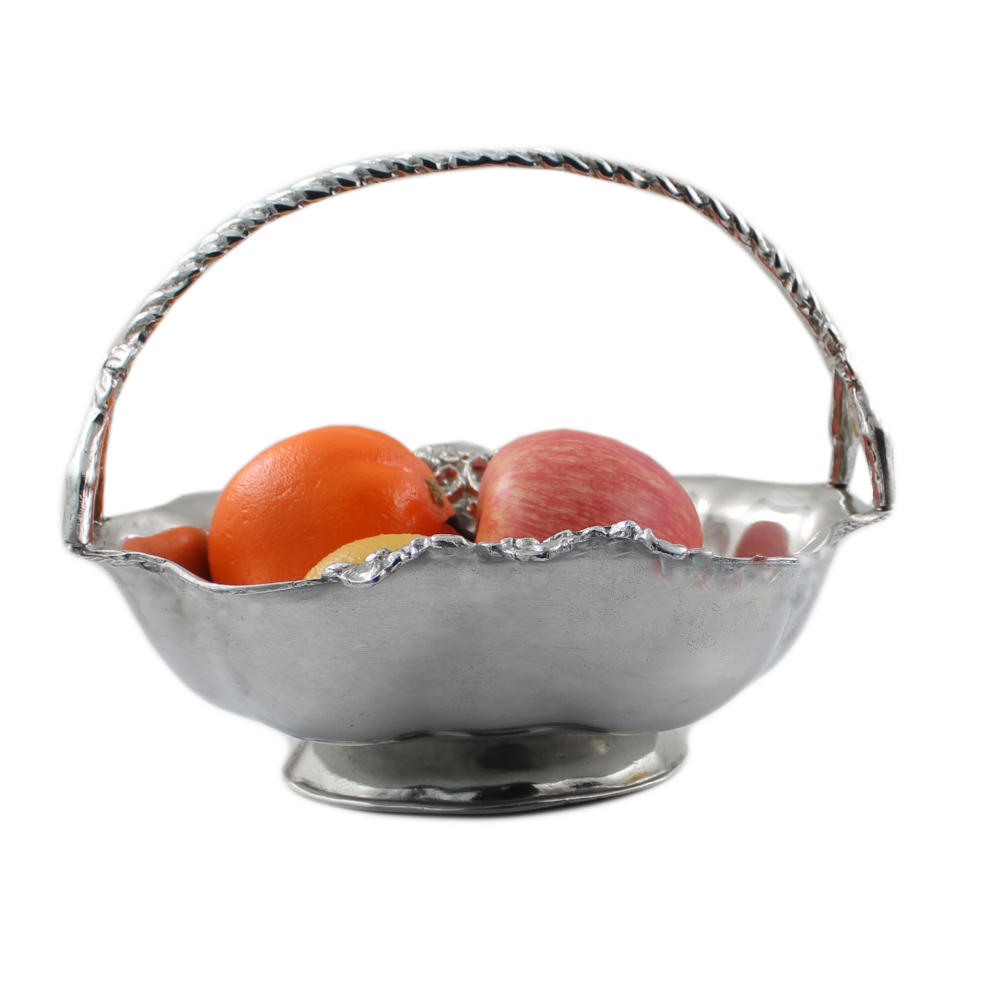 Svuota-tasche portafrutta in peltro con manico, lavorato a mano