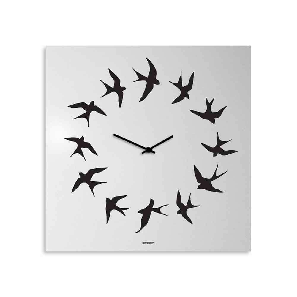 L'orologio da muro Volo di dESIGNoBJECT ha una eleganza tutta sua che si libra col volo delle dodici rondini. Questo orologio da parete ha un certo gusto minimalista e racchiude in tanta semplicità  la sensazione quotidiana che a volte abbiamo, che il tempo voli. E come in tutti i capolavori di dESIGNoBJECT c'è bellezza, funzionalità  e volontà  di durare nel tempo. Sarà  dunque funzionale come deve essere un orologio (quindi preciso!), ma allo stesso tempo gagliardo e magari anche solidale con lo stile che avete scelto per casa vostra! Volete sapere di cosa è fatto? E' una lamiera tagliata a laser e laccata artigianalmente a polvere. Poi viene serigrafato a mano con una precisione che gli svizzeri si sognano! E' disponibile in bianco e nero. Per farlo funzionare va inserita una batteria AA, tutto chiaro?