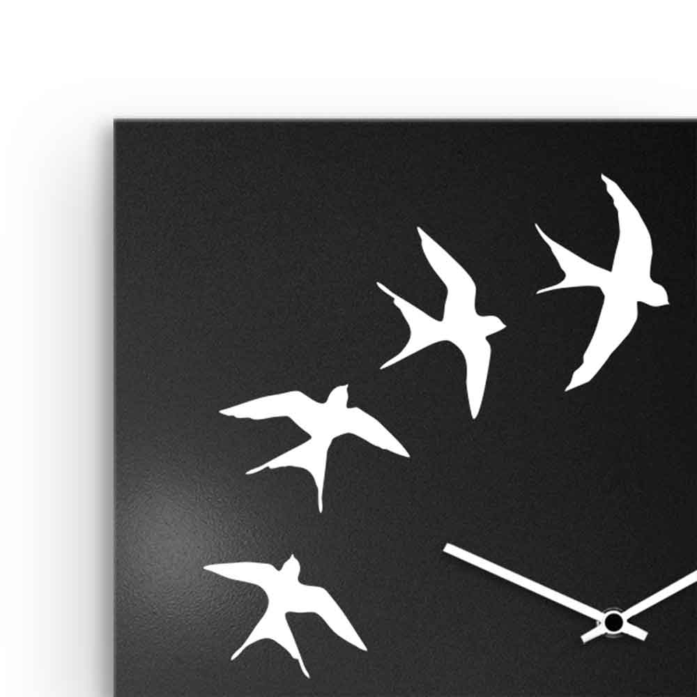 L'orologio da muro Volo di dESIGNoBJECT ha una eleganza tutta sua che si libra col volo delle dodici rondini. Questo orologio da parete ha un certo gusto minimalista e racchiude in tanta semplicità  la sensazione quotidiana che a volte abbiamo, che il tempo voli. E come in tutti i capolavori di dESIGNoBJECT c'è bellezza, funzionalità  e volontà  di durare nel tempo. Sarà  dunque funzionale come deve essere un orologio (quindi preciso!), ma allo stesso tempo gagliardo e magari anche solidale con lo stile che avete scelto per casa vostra! Volete sapere di cosa è fatto? E'€una lamiera tagliata a laser e laccata artigianalmente a polvere. Poi viene serigrafato a mano con una precisione che gli svizzeri si sognano! E' disponibile in bianco e nero. Per farlo funzionare va inserita una batteria AA, tutto chiaro?