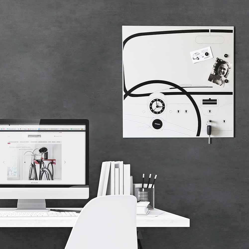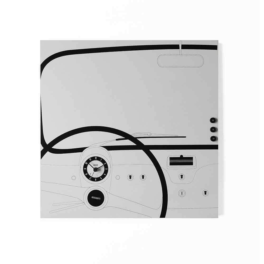 L'orologio da muro Cinquino di dESIGNoBJECT è un omaggio ad una icona del lifestyle italiano, un tributo di Carmine Sessa alla 500. Oltre che un orologio da parete, è anche un organizer provvisto di tre clip magnetiche da applicare sulla superficie per appendere foto, biglietti e persino le vostre chiavi! E come in tutti i capolavori di dESIGNoBJECT c'è bellezza, funzionalità  e volontà  di durare nel tempo. Sarà  dunque funzionale come deve essere un orologio (quindi preciso!), ma con lo stile solidale a quello che avete scelto per casa vostra! Volete sapere di cosa è fatto? E'€una lamiera tagliata a laser e laccata artigianalmente a polvere. Poi viene serigrafato a mano con una precisione che gli svizzeri si sognano! Per farlo funzionare va inserita una batteria AA, tutto chiaro?