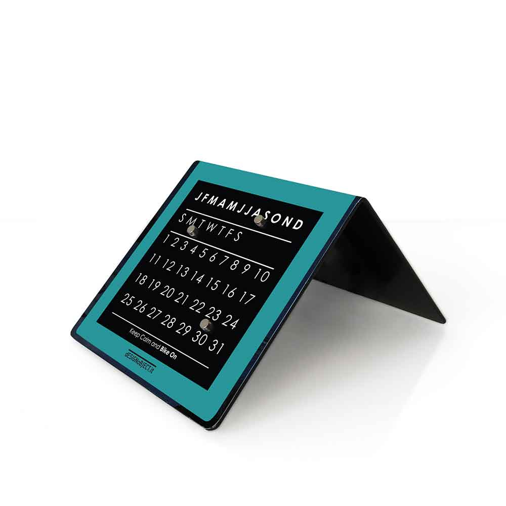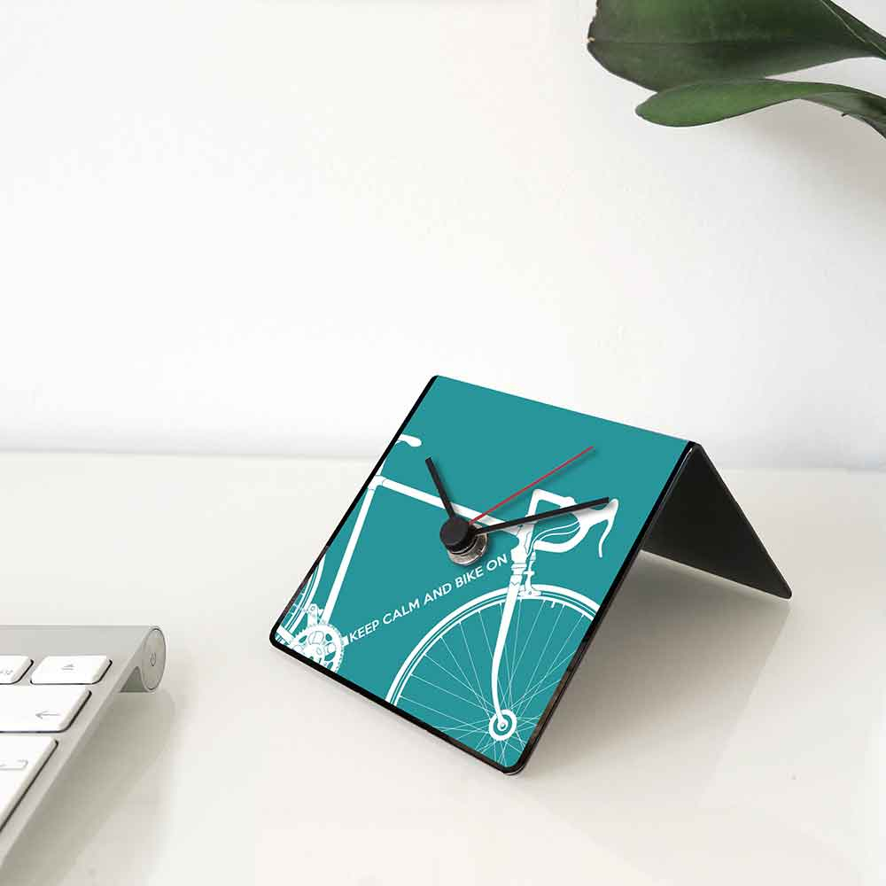 L'orologio da tavolo Bike azzurro dESIGNoBJECT è anche un calendario perpetuo, sul retro. Appartiene alla collezione Bike, ed è un tributo agli appassionati di bicicletta. Il motto è infatti un simpatico Keep Calm And Bike On! dESIGNoBJECT è maestra in design e bellezza, senza dimenticare la funzionalità  e la volontà  di durare nel tempo. Disponibile in diversi colori: verde, azzurro, grigio, blu, fucsia e arancione. E' una lamiera tagliata a laser, piegata e laccata artigianalmente a polvere. Con tre pratici magneti per aggiornare il calendario perpetuo, inclusi nella confezione!
