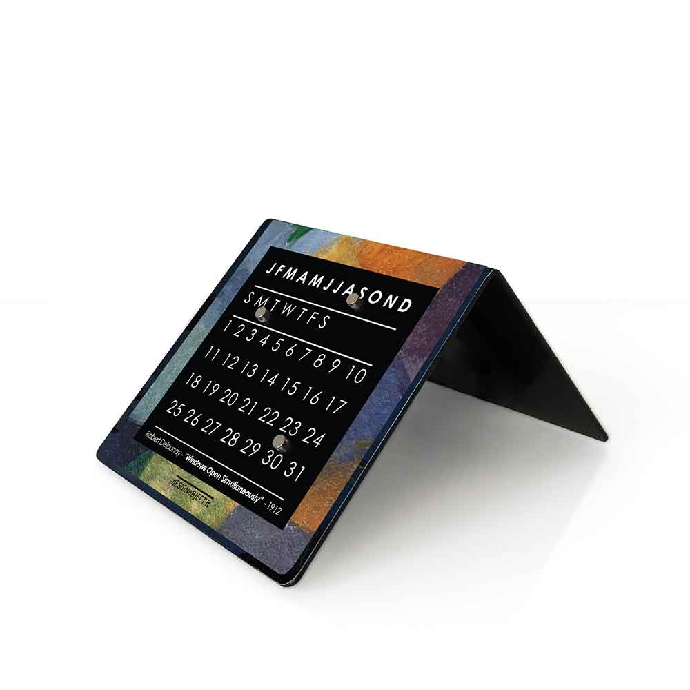 L'orologio da tavolo Delauney dESIGNoBJECT è anche un calendario perpetuo, sul retro. Appartiene alla collezione Guggenheim e vuole portare sulle nostre scrivanie e mensole l'arte in formato pop. Tenerlo davanti agli occhi tutti i giorni vuol dire collezionare un pezzo d'arte da collezionismo. dESIGNoBJECT è avvezza ai capolavori di design dove c'è bellezza, funzionalità  e volontà  di durare nel tempo. Disponibile con diversi soggetti: Mondrian, Delauney, Kandinsky, Lissitzky, Malevich, Van Deosburg. E' una lamiera tagliata a laser, piegata e laccata artigianalmente a polvere. Con tre pratici magneti per aggiornare il calendario perpetuo, inclusi nella confezione!