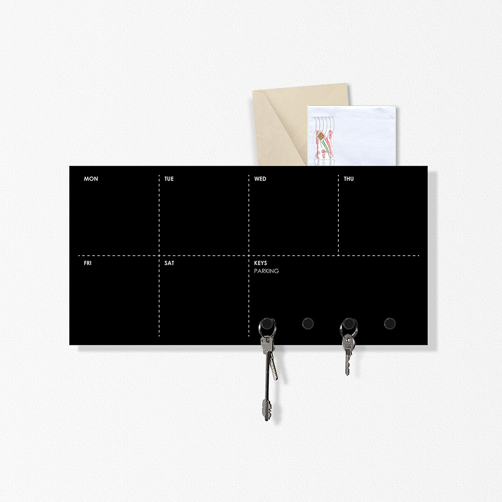 Il nuovissimo portachiavi da parete Week di DesignObject è pensato per diverse funzioni organizzative che tutti abbiamo in casa, ovvero è un pratico portalettere da tenere in entrata, quando arrivate e non sapete dove appoggiare la posta. Ma è anche un organizer, una agenda perpetua settimanale dove potete segnarvi tutti gli appuntamenti, appendere bigliettini, memo, scontrini e foto, grazie ai tre magneti inclusi nella confezione. E' anche facile da montare a parete grazie ai due fischer inclusi nella confezione. Se invece avete deciso di farne un delizioso regalo, potete scegliere tra il nero o il grigio chiaro (RAL 7035). A voi la scelta!