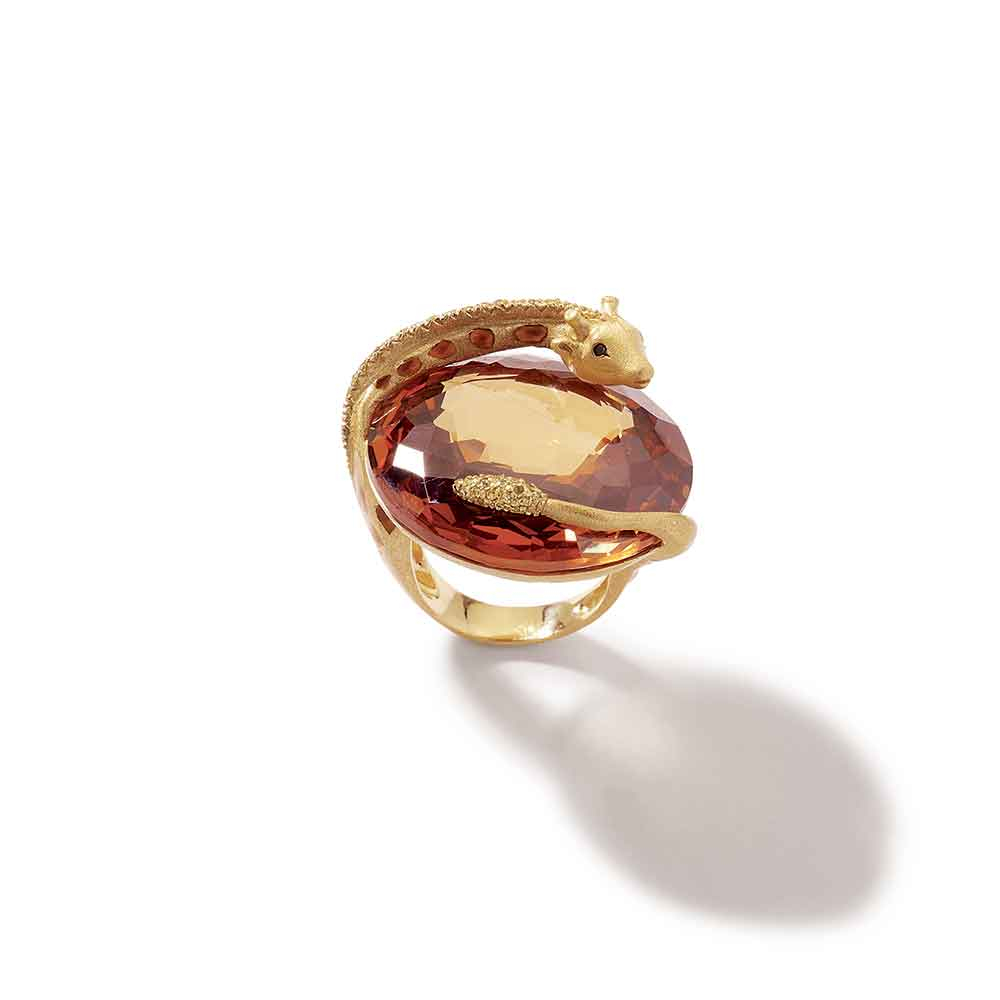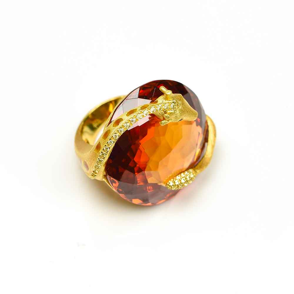 Anello con giraffa in argento, quarzo citrino, zirconi gialli e smalto