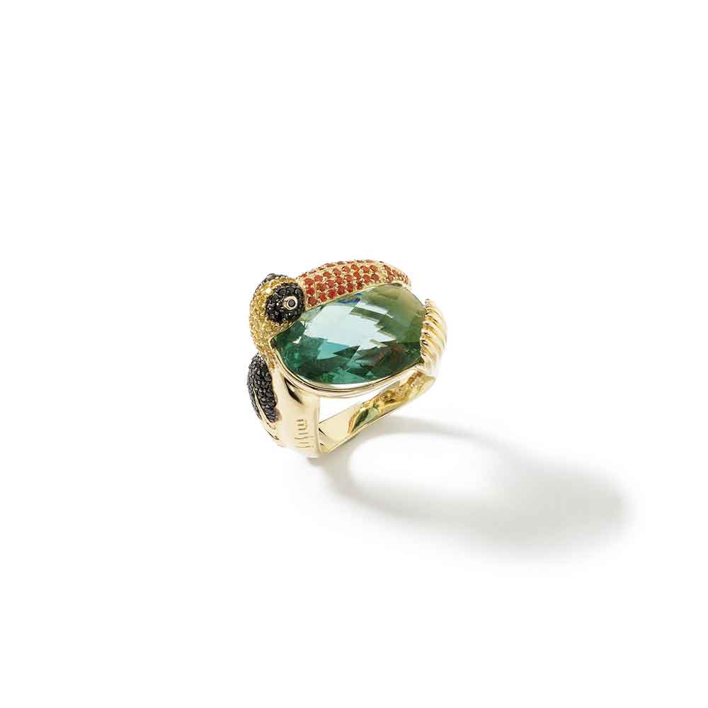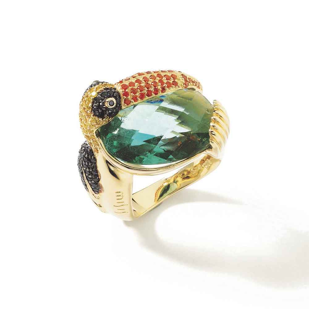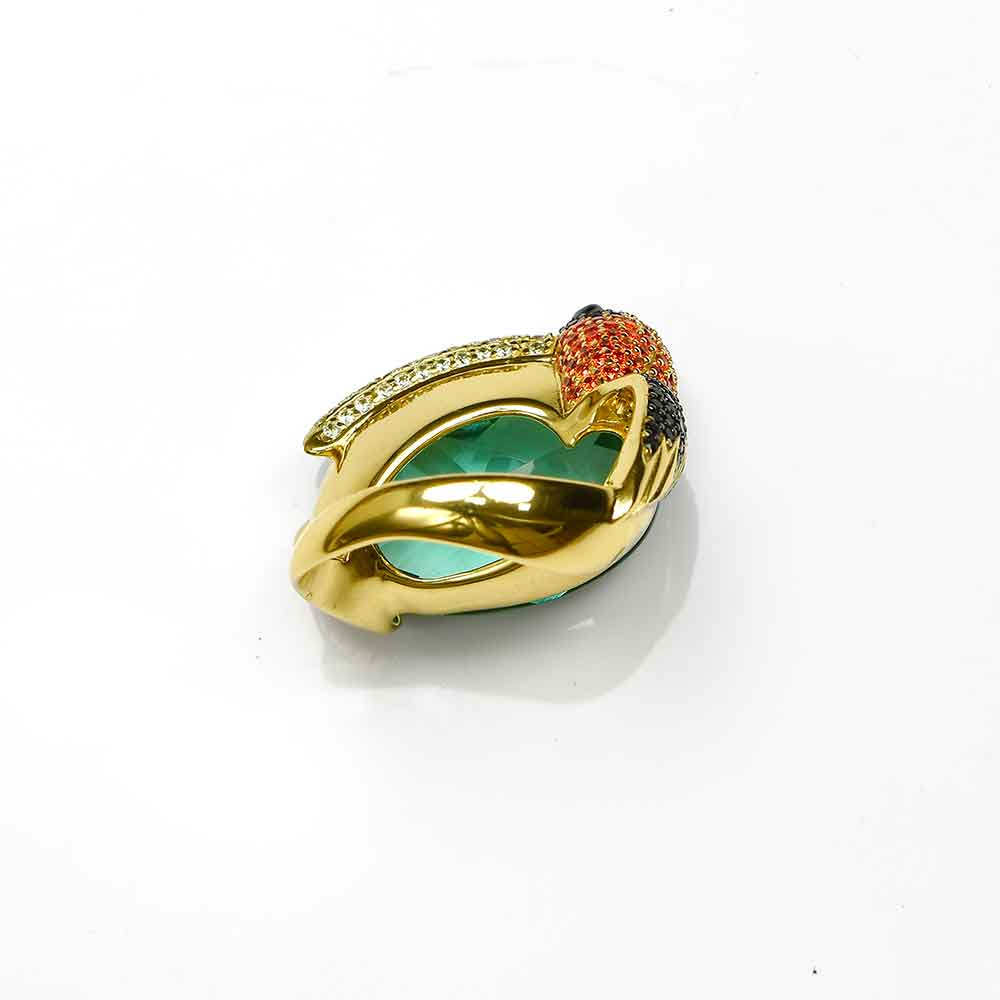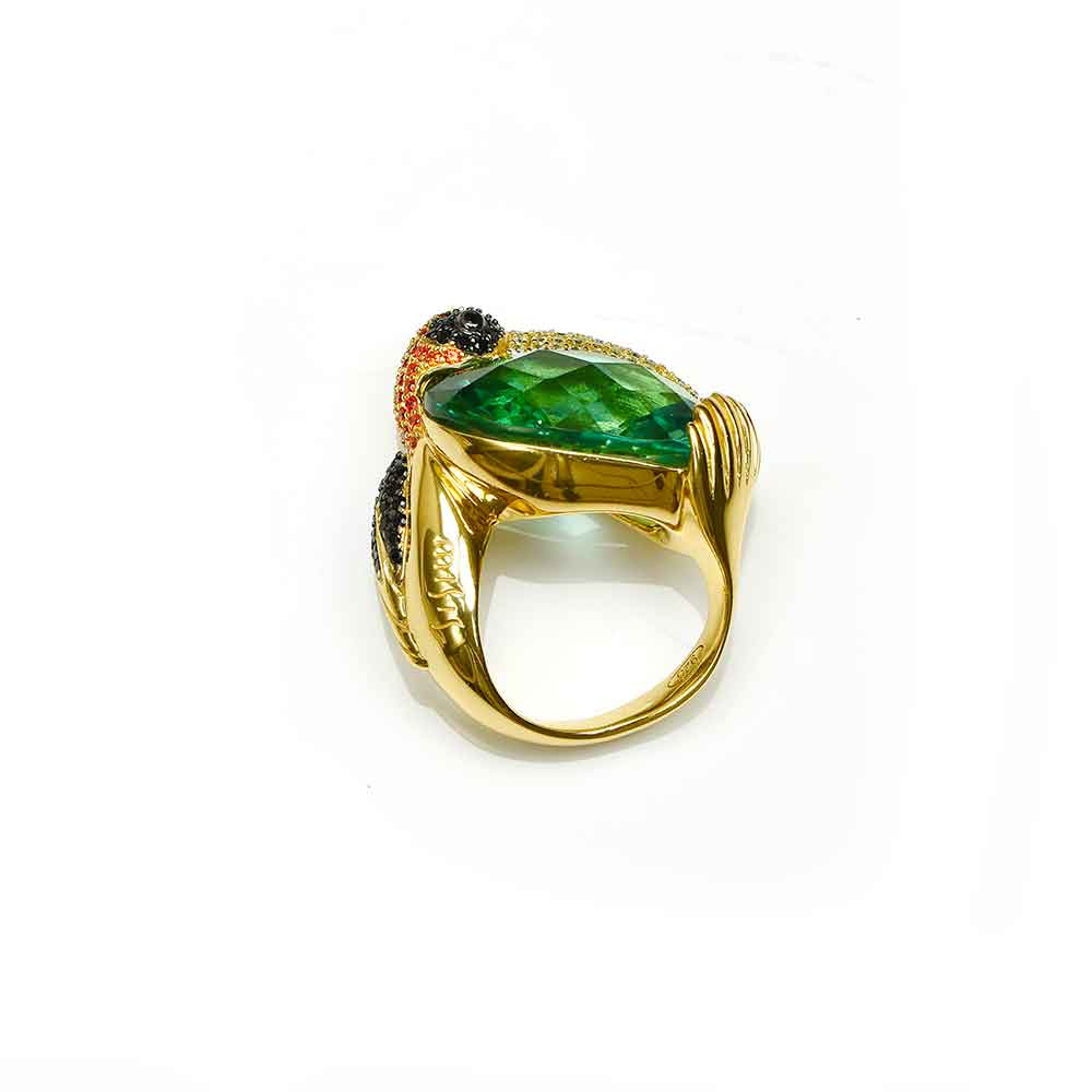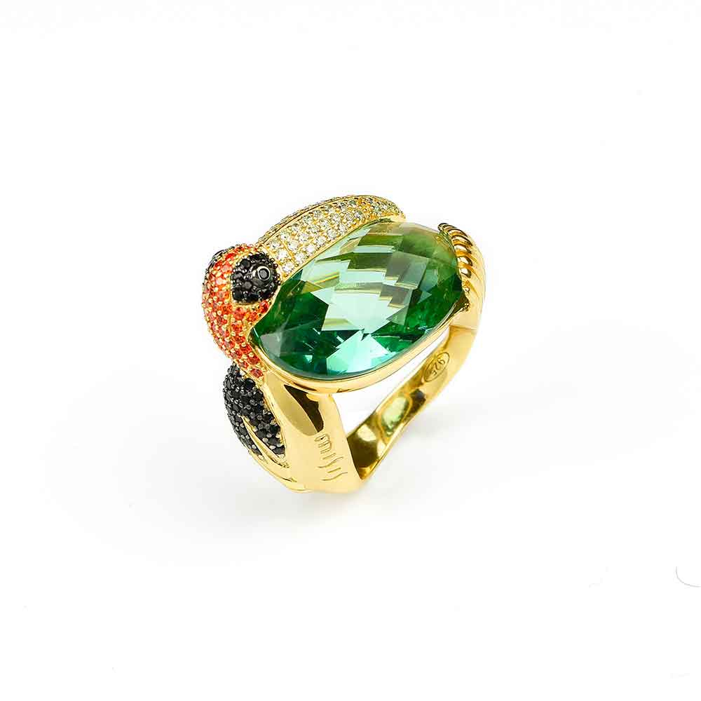 Anello design tucano in argento, ossidiana verde e zirconi colorati | E-Italy | 100% Made in Italy