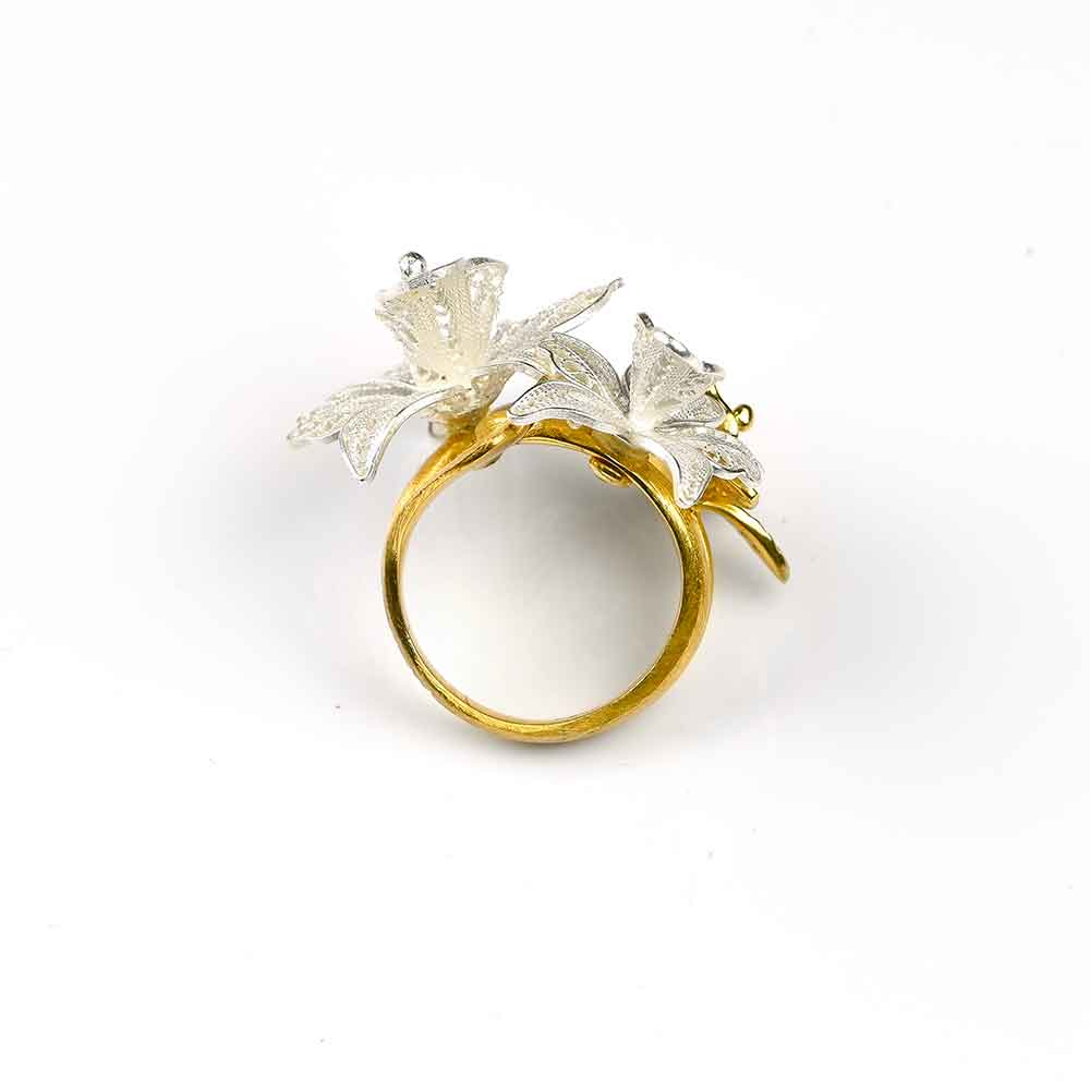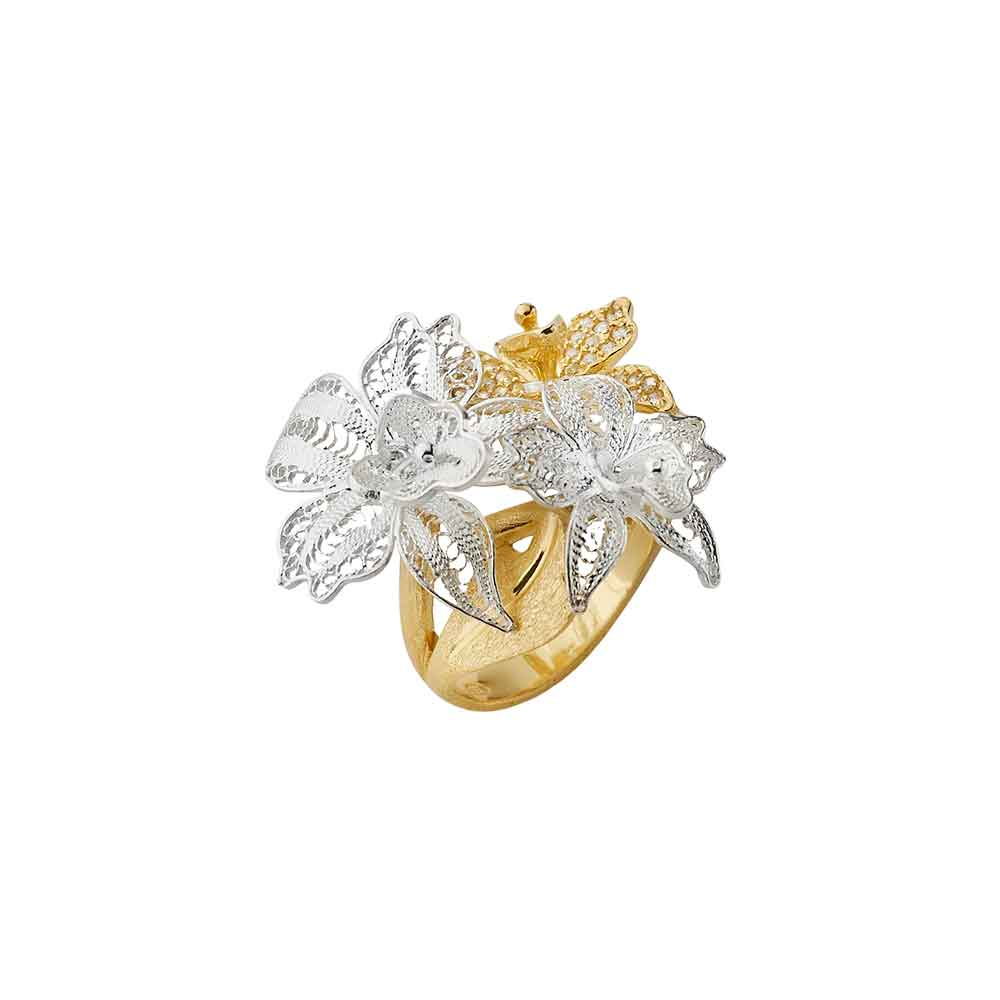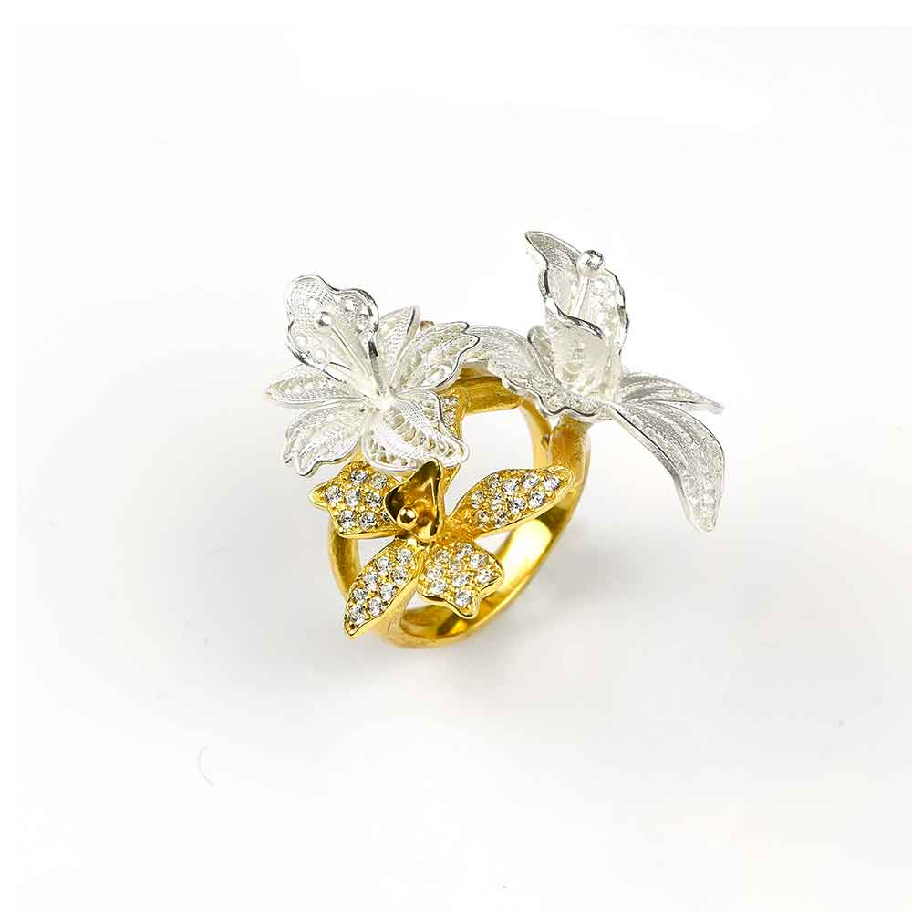 Anello con orchidee di filigrana in argento e zirconi bianchi