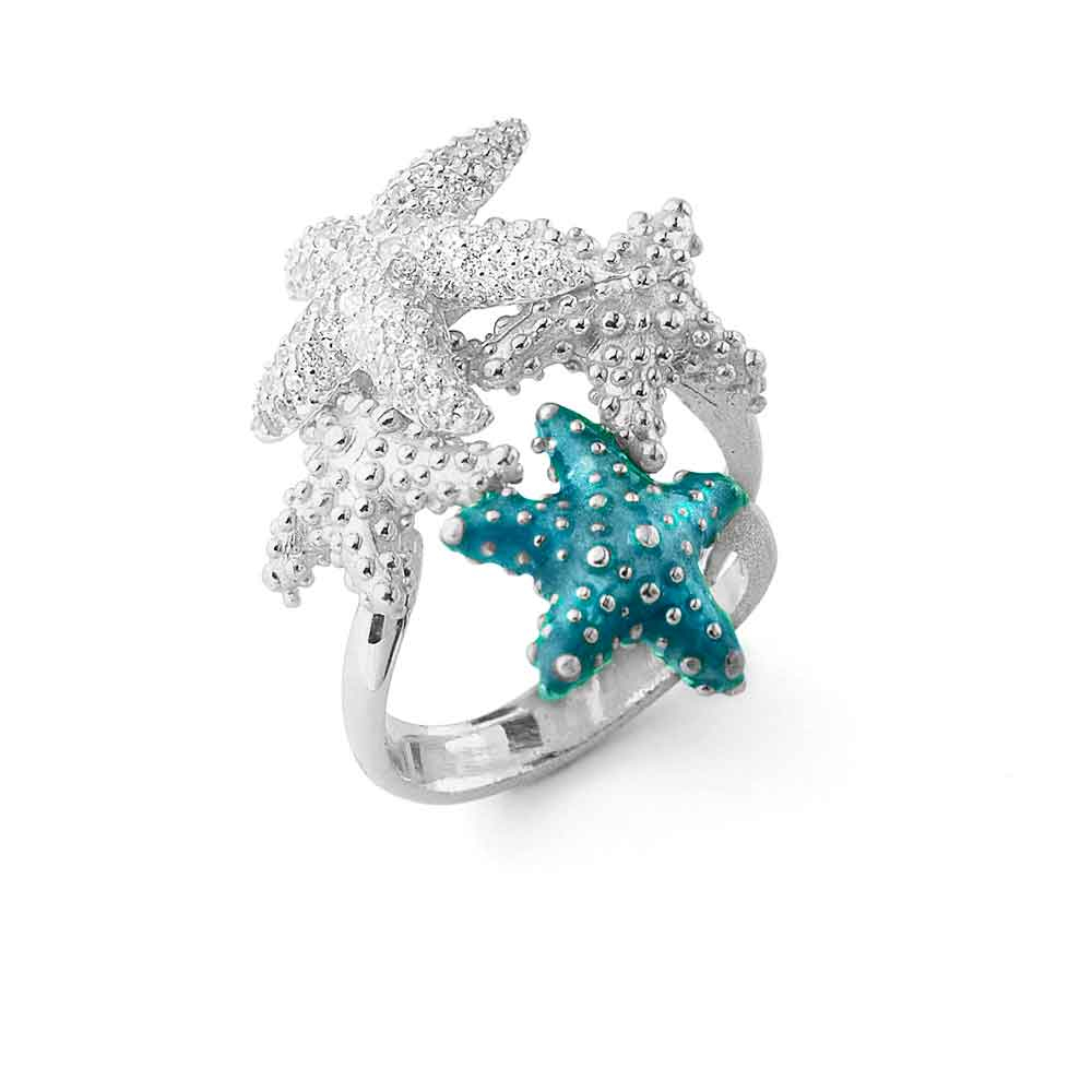 Anello con stelle marine in argento, smalto azzurro e zirconi | E-Italy | 100% Made in Italy