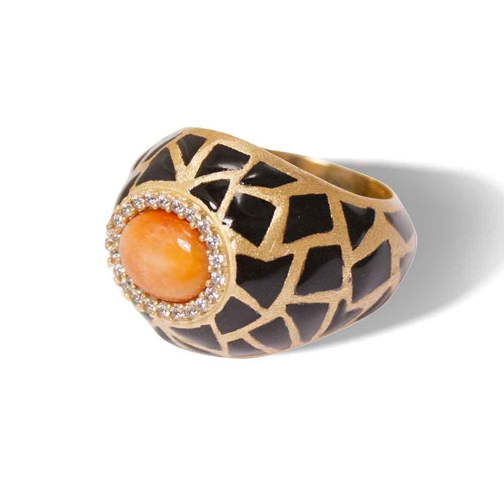 Come da uno scrigno emerge la gemma centrale in conchiglia naturale di questo anello a cupola, mentre gli smalti neri craquelé le danzano intorno ipnotici, e la corona di zirconi bianchi ne esalta la luminosità. La collezione Artemide ci regala una prova di alta gioielleria, unita ad un design inaspettato e a materiali preziosi sorprendenti, che impreziosirà la mano di chiunque sarà così audace da sceglierla per sé. I gioielli Misis nascono dall'incontro tra le mani sapienti di artigiani orafi italiani e l'amore smisurato per la natura in tutte le sue manifestazioni: il risultato sono piccole ma preziosissime opere d'arte che puoi decidere di indossare per lasciare il segno ed essere unica! Tecniche di alta gioielleria ed un design non convenzionale sono la cifra che caratterizza gli anelli di questa collezione, che non finisce mai di stupire.