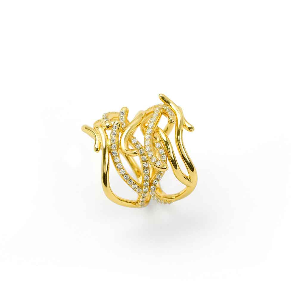 L'illusione di avere al dito un vero ramo di corallo sarà totale, grazie a questo anello della collezione Reef Party. L'argento placcato oro 18 kt si ricopre qui di scintillanti zirconi bianchi, in un abbraccio marino sorprendente. L'intreccio prezioso che racchiude questo anello ha carattere ed eleganza, e si abbina ad ogni mise. I gioielli Misis nascono dall'incontro tra le mani sapienti di artigiani orafi italiani e l'amore smisurato per la natura in tutte le sue manifestazioni: il risultato sono piccole ma preziosissime opere d'arte che puoi decidere di indossare per lasciare il segno ed essere unica! Tecniche di alta gioielleria ed un design non convenzionale sono la cifra che caratterizza gli anelli di questa collezione, che non finisce mai di stupire.