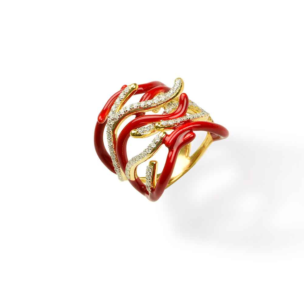 Anello design ramo di coralli in argento, smalto rosso e zirconi | E-Italy | 100% Made in Italy