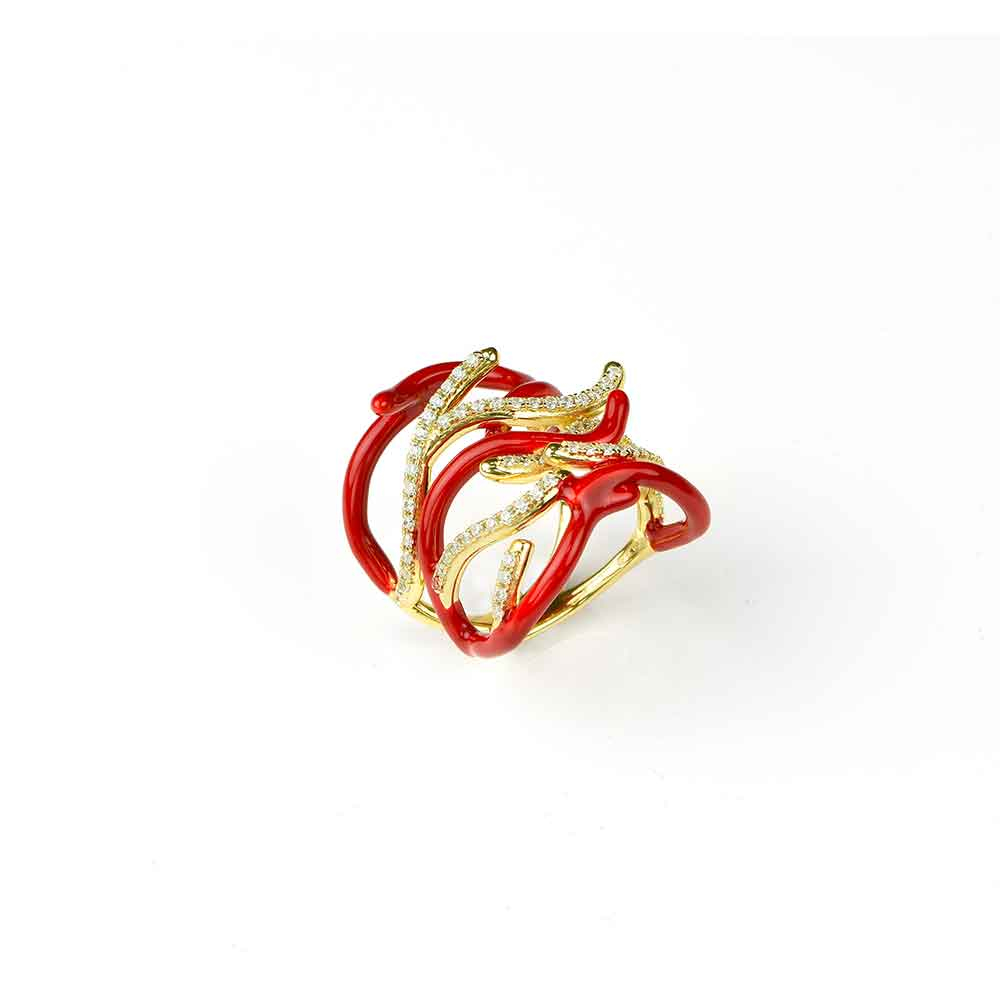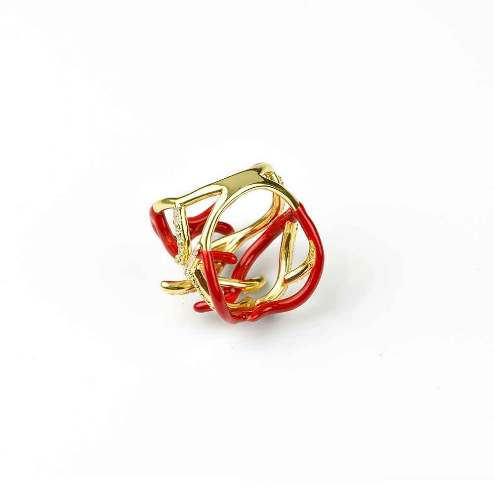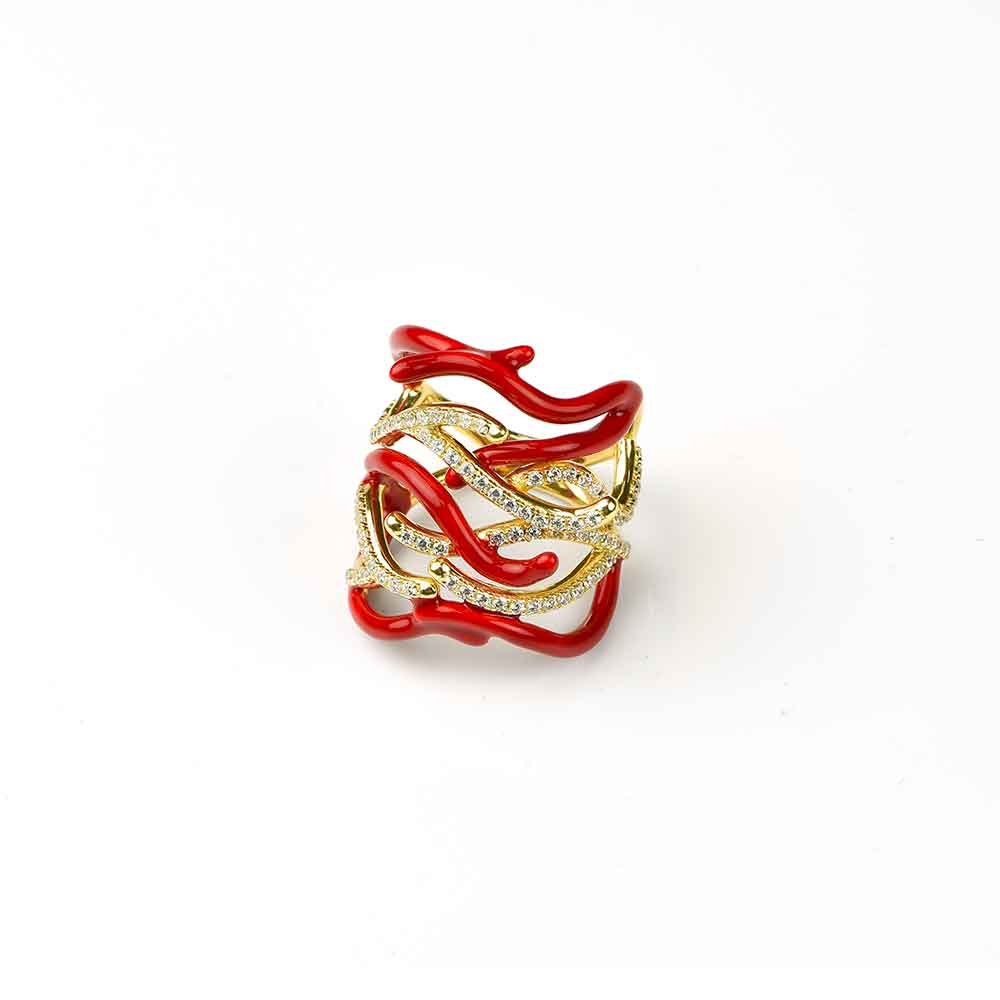 Anello design ramo di coralli in argento, smalto rosso e zirconi