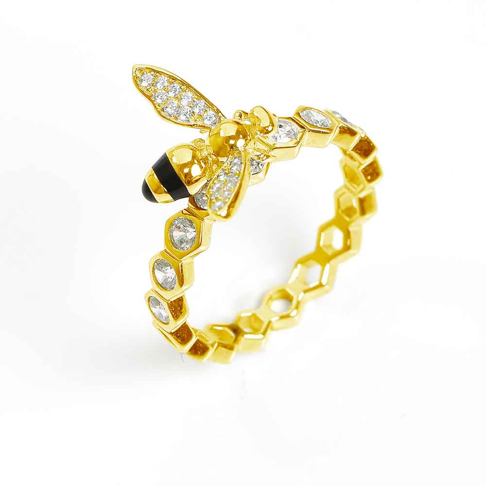 Le api, simbolo della fragilità della natura ed insieme della sua forza, popolano i gioielli della collezione Life, realizzati in argento 925 placcato oro. Questo splendido eternity ring ad esagoni in zirconi bianchi è inaspettatamente animato da un'ape in smalto e zirconi, che si è posata leggera su di esso. Indossare questo anello è il nostro modo per dire che teniamo alla natura e che sappiamo quanto la sua tutela sia importante per garantire un futuro al nostro mondo. I gioielli Misis nascono dall'incontro tra le mani sapienti di artigiani orafi italiani e l'amore smisurato per la natura in tutte le sue manifestazioni: il risultato sono piccole ma preziosissime opere d'arte che puoi decidere di indossare per lasciare il segno ed essere unica! Tecniche di alta gioielleria ed un design non convenzionale sono la cifra che caratterizza gli anelli di questa collezione, che non finisce mai di stupire.