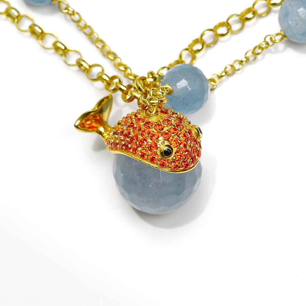 La collezione Krill è popolata di piccole creature marine che giocano con pietre naturali, scelte accuratamente per la loro bellezza. Questo bracciale è composto di due fili in argento 925 placcato oro, uno dei quali è disseminato di biglie sfaccettate di agata azzurra. Il charm che unisce i due fili rappresenta una piccola balena in agata azzurra e zirconi arancio, in un contrasto di colori che accende il tuo polso. I gioielli Misis nascono dall'incontro tra le mani sapienti di artigiani orafi italiani e l'amore smisurato per la natura in tutte le sue manifestazioni: il risultato sono piccole ma preziosissime opere d'arte che puoi decidere di indossare per lasciare il segno ed essere unica! Tecniche di alta gioielleria ed un design non convenzionale sono la cifra che caratterizza i bracciali di questa collezione, che non finisce mai di stupire.