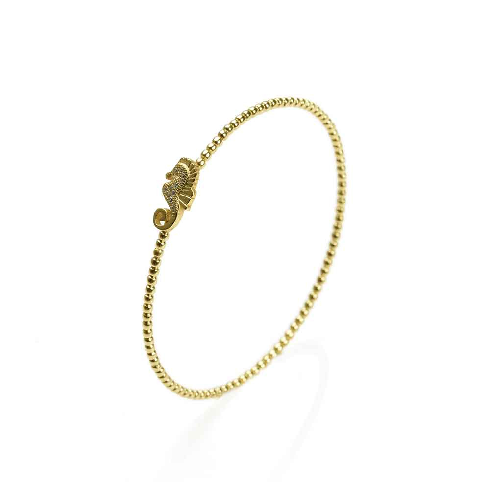 Questo bracciale rigido fatto di piccole biglie in argento 925 placcato oro, è perfetto per esaltare la purezza del cavalluccio marino di zirconi bianchi che lo accompagna. Nella collezione Rivamare troverete gioielli come questo, sorprendenti nella loro semplicità, perfetti per accompagnare qualsiasi outfit, bellissimi da soli o vicini ad altri. I gioielli Misis nascono dall'incontro tra le mani sapienti di artigiani orafi italiani e l'amore smisurato per la natura in tutte le sue manifestazioni: il risultato sono piccole ma preziosissime opere d'arte che puoi decidere di indossare per lasciare il segno ed essere unica! Tecniche di alta gioielleria ed un design non convenzionale sono la cifra che caratterizza i bracciali di questa collezione, che non finisce mai di stupire.