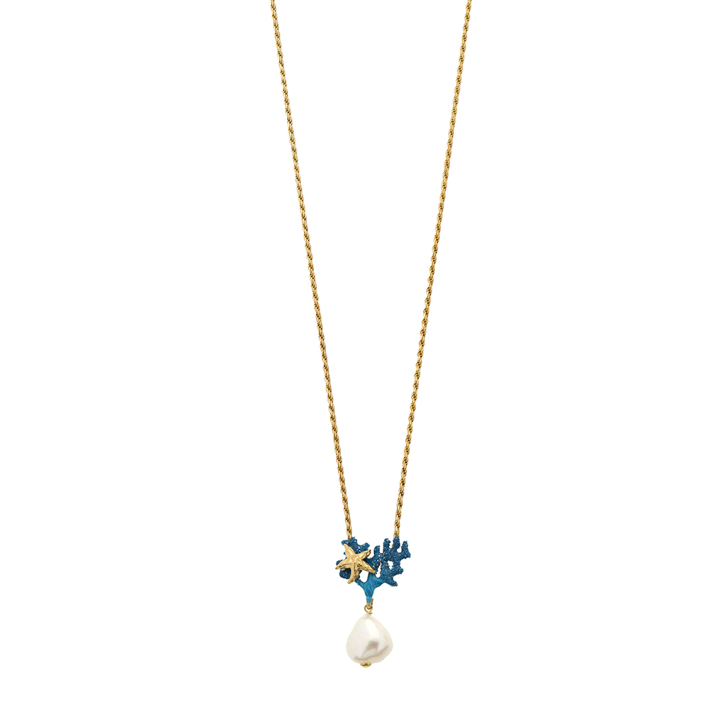La località di Positano presta il nome a questa collezione spettacolare di gioielli, che sono un vero inno al mare e alle sue creature. Questo pendente è una poesia fatta gemma: da un ramo di corallo di argento 925 ricoperto di smalto blu sabbiato, pende una perla di acqua dolce, mentre una piccola stella marina sbircia dal ramo. Non ti sembra di avere un pezzetto di mare al collo? I gioielli Misis nascono dall'incontro tra le mani sapienti di artigiani orafi italiani e l'amore smisurato per la natura in tutte le sue manifestazioni: il risultato sono piccole ma preziosissime opere d'arte che puoi decidere di indossare per lasciare il segno ed essere unica! Tecniche di alta gioielleria ed un design non convenzionale sono la cifra che caratterizza le collane e i pendenti di questa collezione, che non finisce mai di stupire.