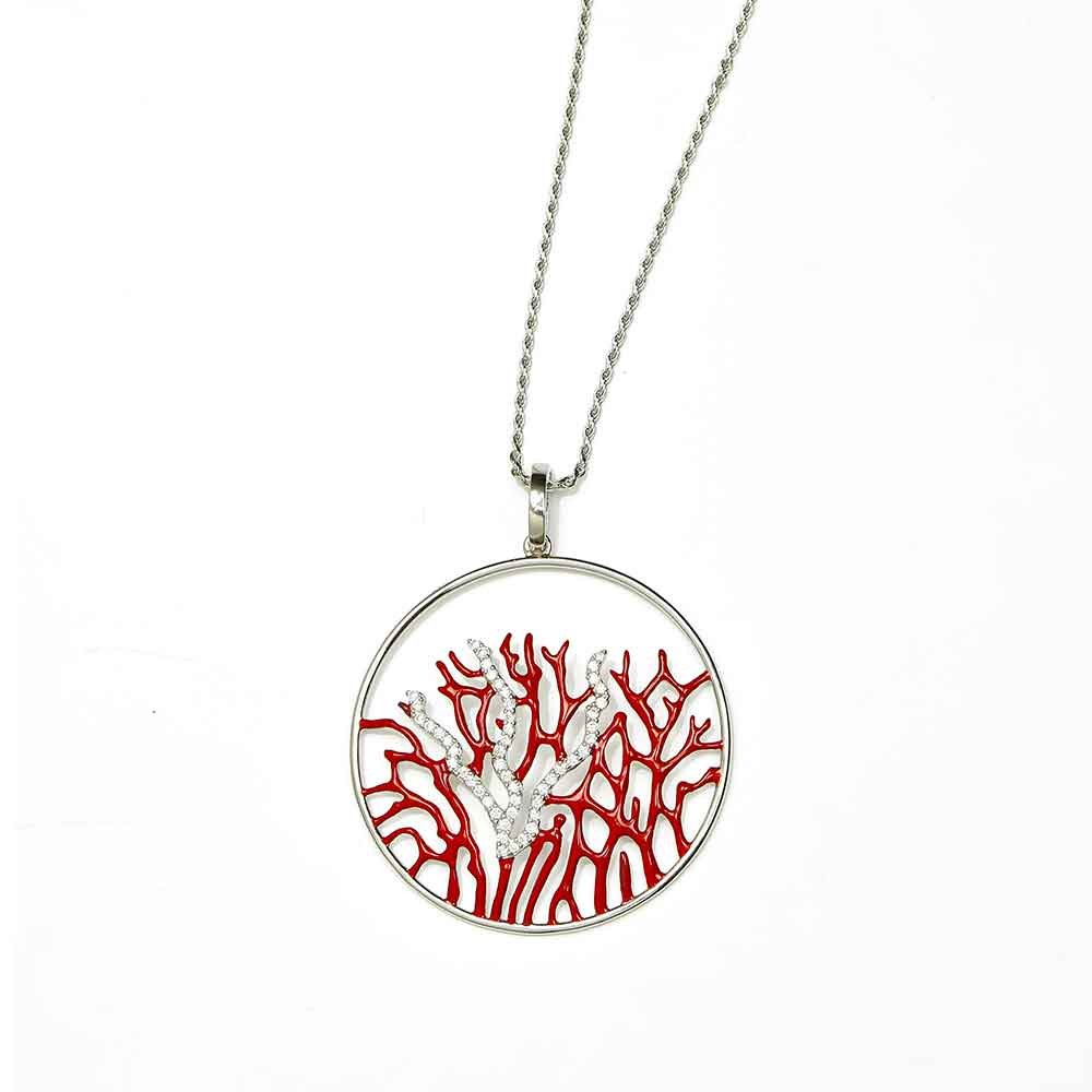 Catena in argento con pendente ramo di corallo in smalto e zirconi