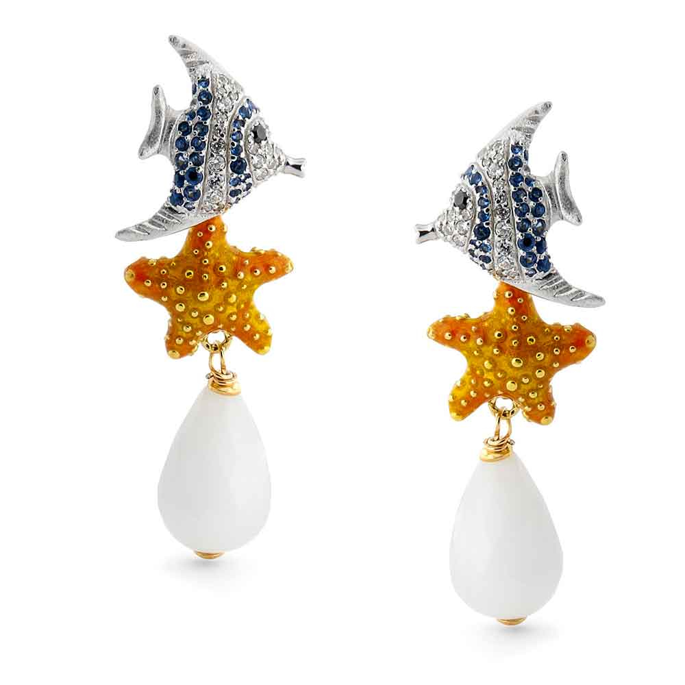 Orecchini pendenti in argento con animali marini in zirconi, smalto e goccia di agata bianca