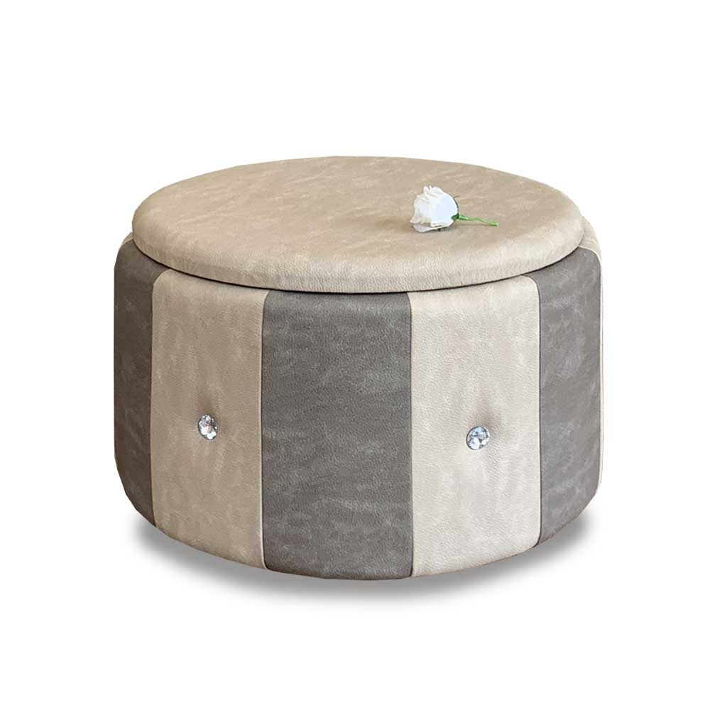 Pouf Beverly contenitore tondo in ecopelle grigio e beige con strass | E-Italy | 100% Made in Italy