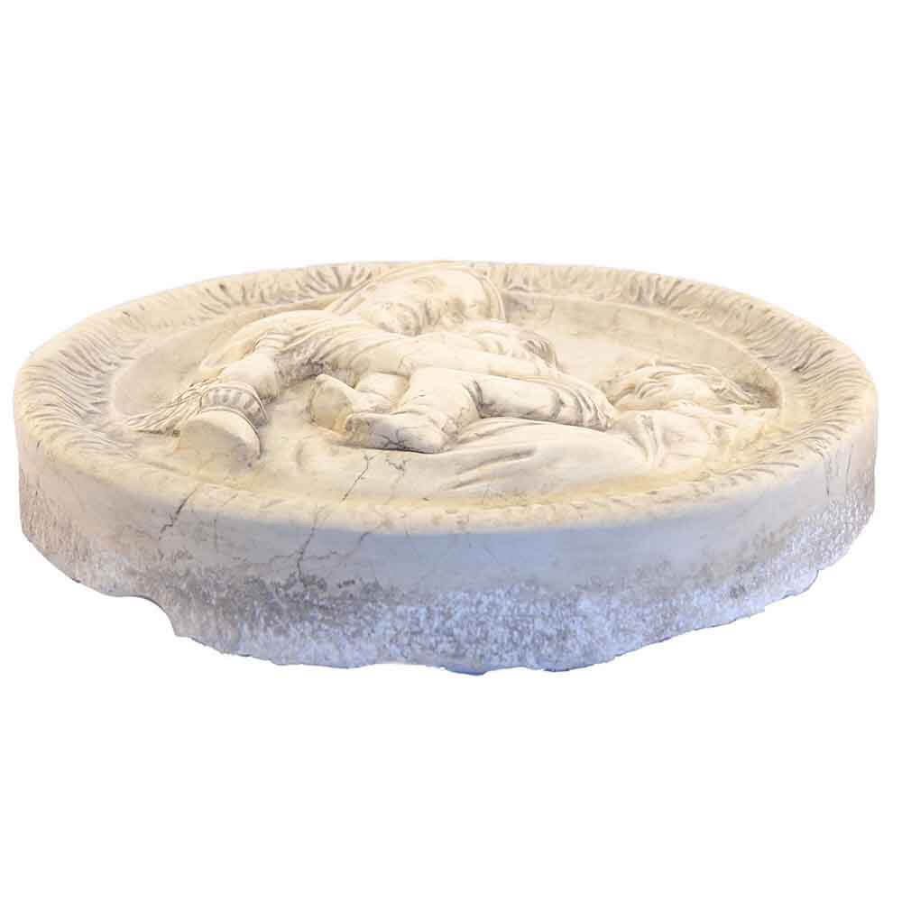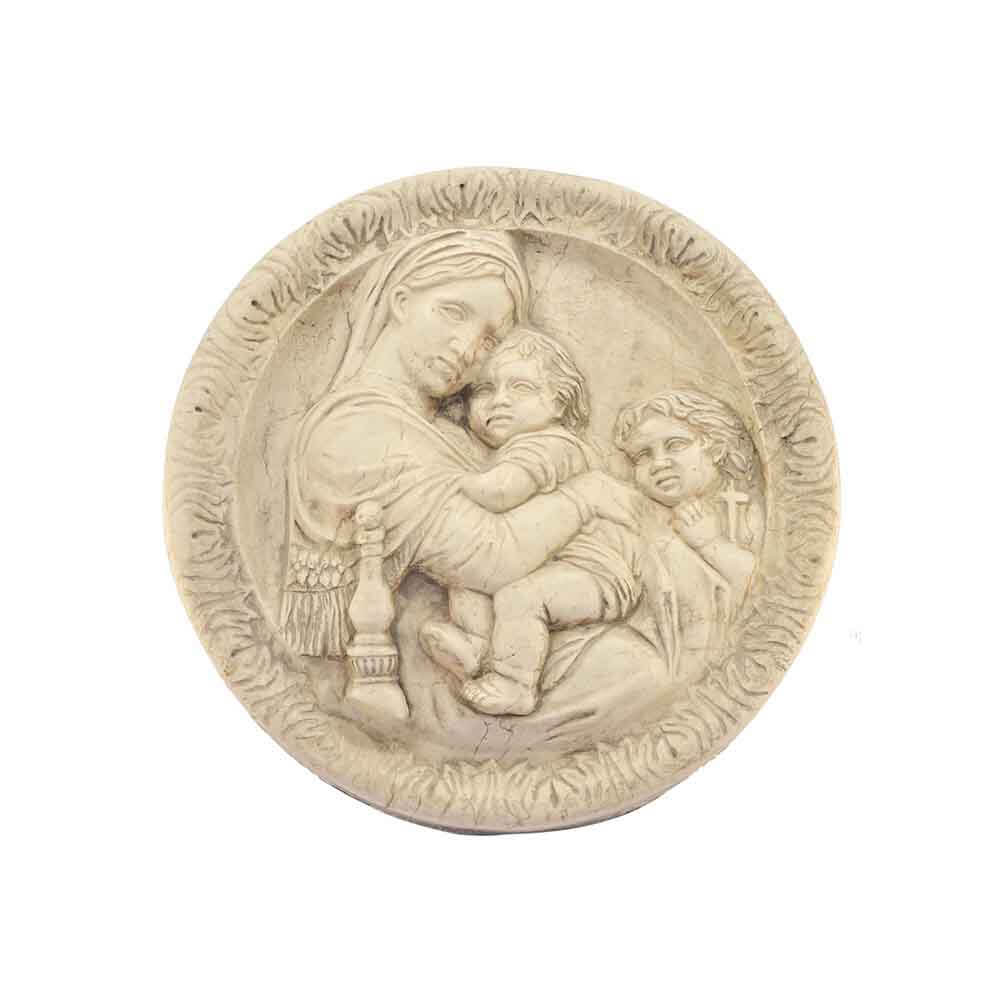 Quest'opera realizzata a mano in marmo Botticino è una scultura le cui figure sono scolpite su di un piano dal quale sporgono con un rilievo.Ll'immagine riprodotta è quindi in contrasto con il fondo da cui si staglia. In questo caso è stata riprodotta una figura sacra, la Madonna con il bambino. Con la lavorazione "consumata dal tempo" sulla superficie questo manufatto assomiglia alle opere fatte nei secoli passati e si presta a contesti di elevata eleganza e prestigio. L'autenticità del prodotto artigianale di ricercata qualità MADE IN ITALY è garantita dall'incisione del marchio sui manufatti"ARTE 2000 Italy Hand carved".