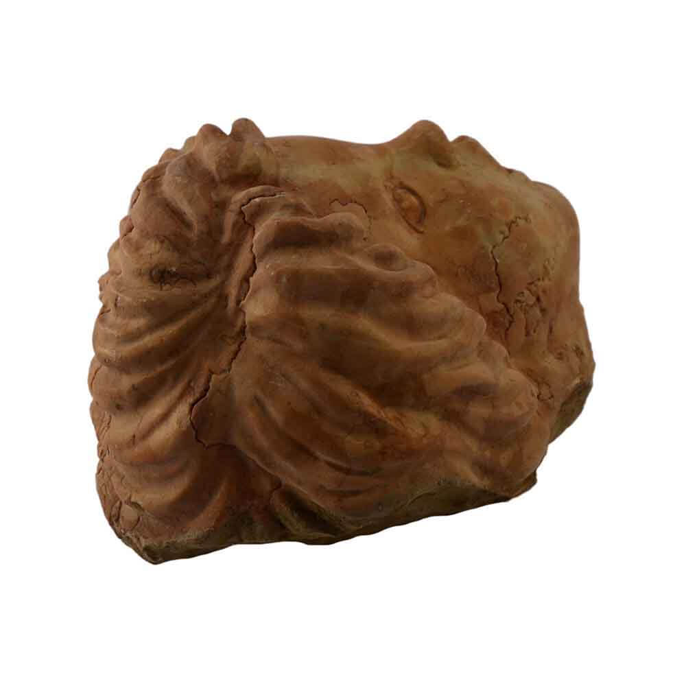 Quest'opera realizzata a mano in marmo Rosso Asiago raffigura la tipica maschera con volto umano o animale stilizzato. Generalmente si può impiegare a parete come decorazione, ma il suo utilizzo più diffuso è come ornamento per fontana con un foro all'interno della bocca per l'uscita dell'acqua. In questo caso è stata riprodotta la testa di un putto, che ben si presta all'inserimento di dimore di pregio e particolare eleganza classica. Con la lavorazione "consumata dal tempo" sulla superficie questo manufatto assomiglia alle opere fatte nei secoli passati. L'autenticità del prodotto artigianale di ricercata qualità MADE IN ITALY è garantita dall'incisione del marchio sui manufatti "ARTE 2000 Italy Handcarved".