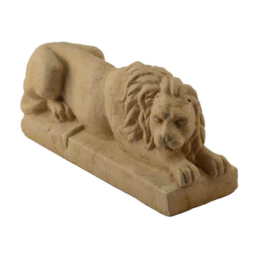 Quest'opera realizzata a mano in Trani è una statua di piccole dimensioni scolpita a foggia di leone sdraiato. Questo è il modo più usato in ogni epoca per raffigurare ed esprimere artisticamente le idee degli scultori. La lavorazione finale di lucidatura a mano esalta i colori naturali del marmo. Questo leone si adatta perfettamente a qualunque stile di casa, può essere usato come decorazione, fermacarte o ferma porte. Ideale per sorprendere con un dono originale e raffinato. L'autenticità del prodotto artigianale di ricercata qualità MADE IN ITALY è garantita dall'incisione del marchio sui manufatti"ARTE 2000 Italy Hand carved".