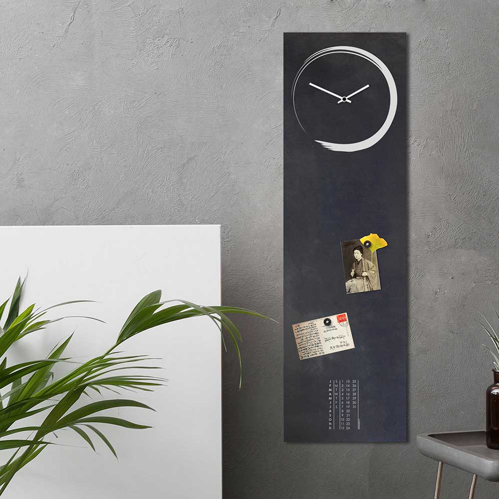 L’orologio e lavagna magnetica da parete S-Enso Clock rievoca atmosfere giapponesi grazie al suo minimalismo ed alla perfezione del cerchio. La parola Enso in giapponese raffigura infatti proprio un cerchio e ci ricorda che dentro possiamo trovare il nostro spazio e il nostro senso. Questa versione del S_Enso Clock aggiunge un’atmosfera industrial ad un grande classico del design, regalandogli la possibilità di inserirsi perfettamente in ogni stile ed in ogni ambiente. L’oggetto è realizzato artigianalmente in lamiera in ferro calamina, tagliata a laser e serigrafata a mano. Il ferro calamina è un materiale ricercato e non convenzionale, che presenta sulla superficie irregolarità, tracce e fiammature che danno un tocco unico e vissuto all’oggetto. La superficie è protetta da un sottile strato di cera naturale che va riapplicata per preservare l’orologio nel tempo.