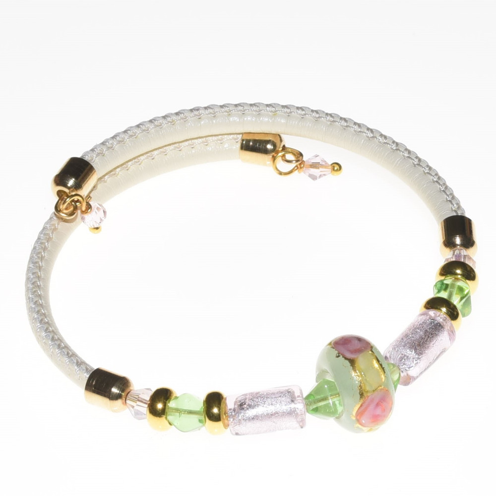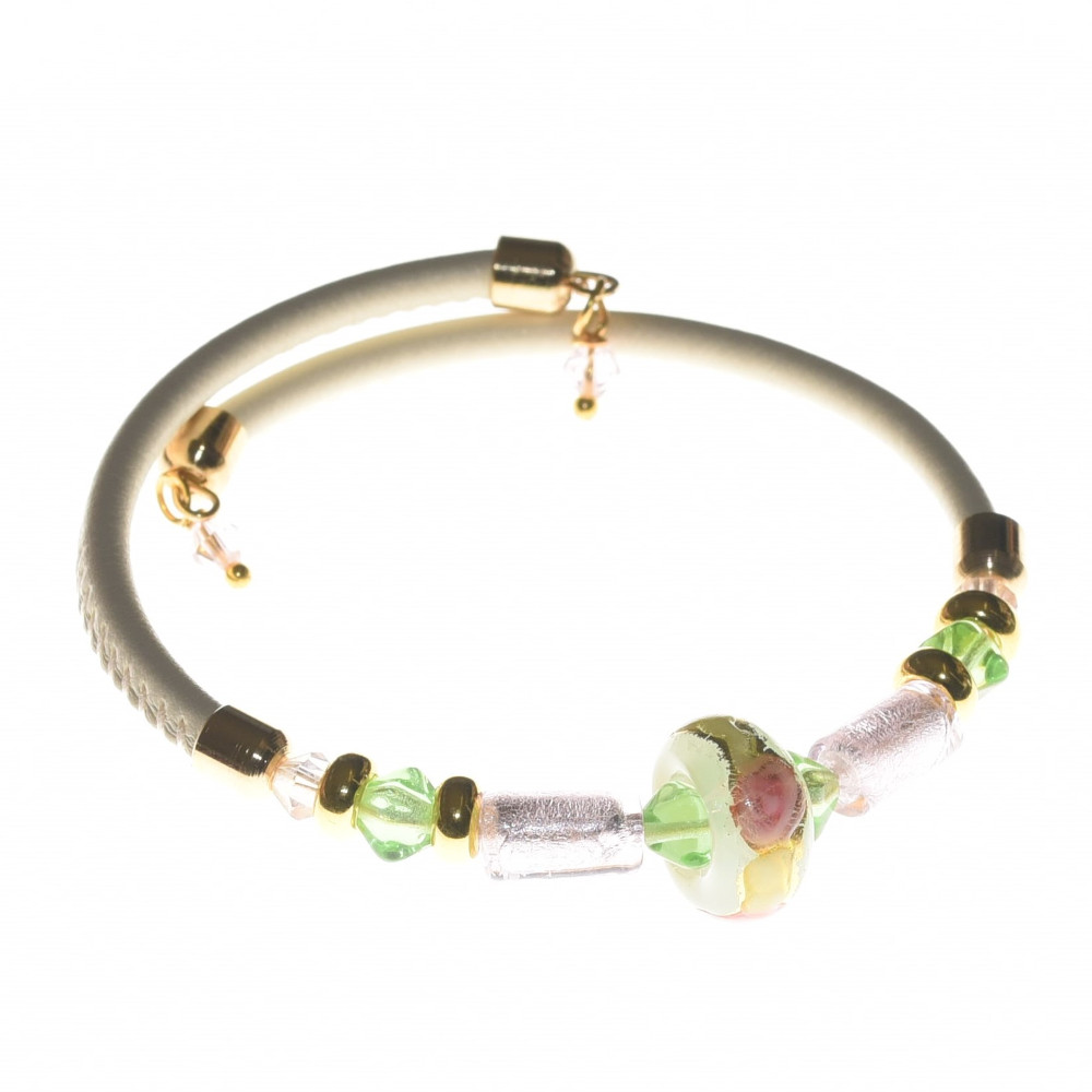La collezione di bracciali regolabili del designer Roberto Perziano è fatta interamente a mano in vero vetro di Murano. Roberto è erede di una famiglia di vetrai dalla lunga storia e mette nelle sue creazioni tutta la passione per il vetro che ha respirato sin da piccolo nel laboratorio di famiglia. Egli destreggia perfettamente l’antica tecnica di lavorazione del vetro “a lume”, che gli permette di creare delle meraviglie come le perle che compongono questo bracciale. Il design è elegante e particolare, alternando perle più grandi, fiorate o in foglia oro, a perle di conteria veneziana; l’anima interna è in acciaio armonico, che permette al bracciale di adeguarsi ad ogni tipo di polso; il cinturino è rifinito in pelle ton-sur-ton, per un effetto elegantissimo.