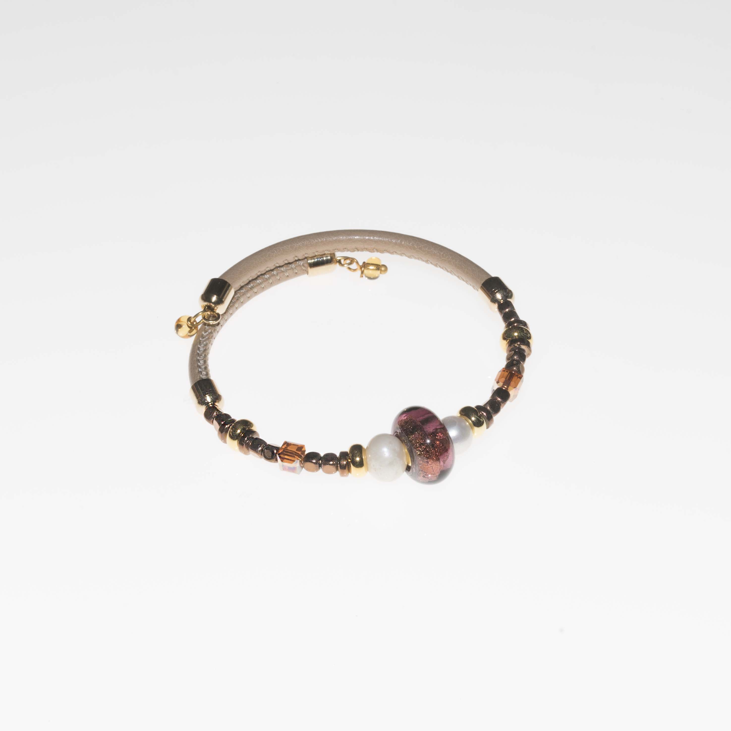 La collezione di bracciali regolabili del designer Roberto Perziano è fatta interamente a mano in vero vetro di Murano. Roberto è erede di una famiglia di vetrai dalla lunga storia e mette nelle sue creazioni tutta la passione per il vetro che ha respirato sin da piccolo nel laboratorio di famiglia. Egli destreggia perfettamente l’antica tecnica di lavorazione del vetro “a lume”, che gli permette di creare delle meraviglie come le perle che compongono questo bracciale. Il design è elegante e particolare, alternando perle più grandi, fiorate o in foglia oro, a perle di conteria veneziana; l’anima interna è in acciaio armonico, che permette al bracciale di adeguarsi ad ogni tipo di polso; il cinturino è rifinito in pelle ton-sur-ton, per un effetto elegantissimo.