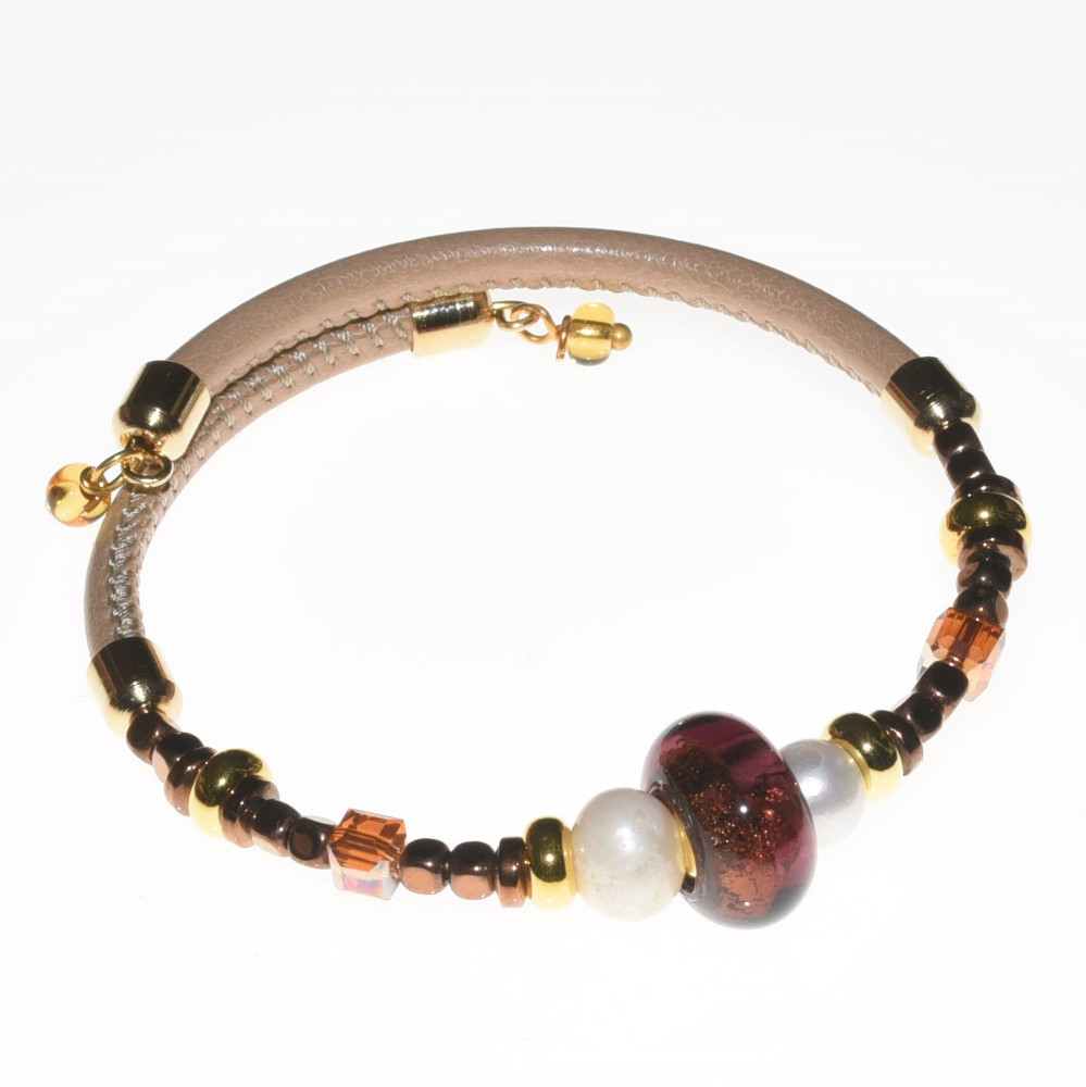 Bracciale rosa in pelle con perla in vetro di Murano PR Lampwork