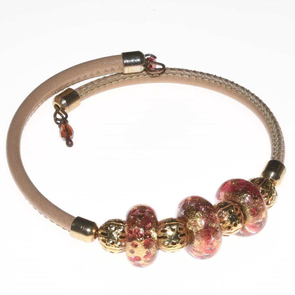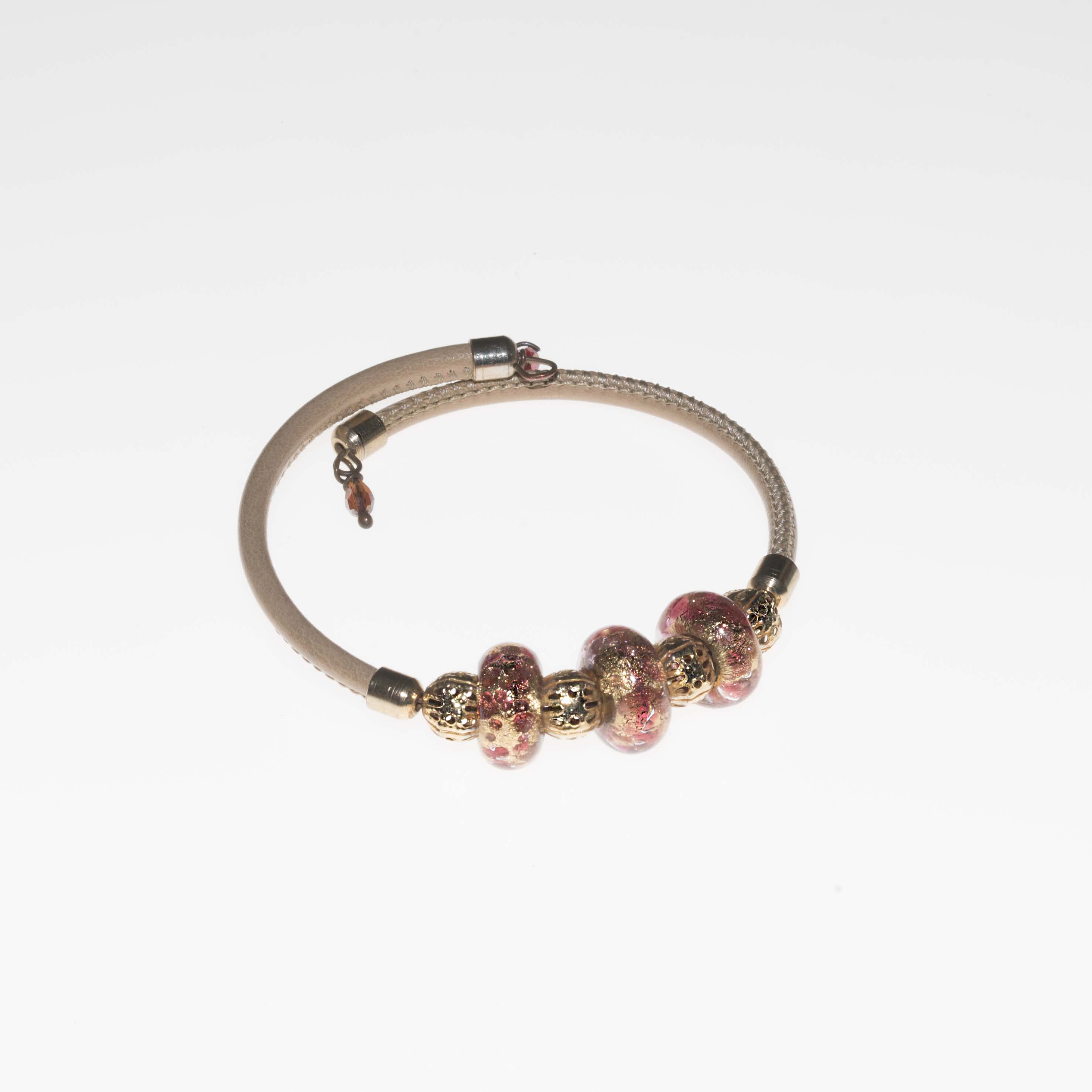 Bracciale rosa in pelle con perle in vetro di Murano PR Lampwork fatto a mano in Italia | E-Italy | 100% Made in Italy