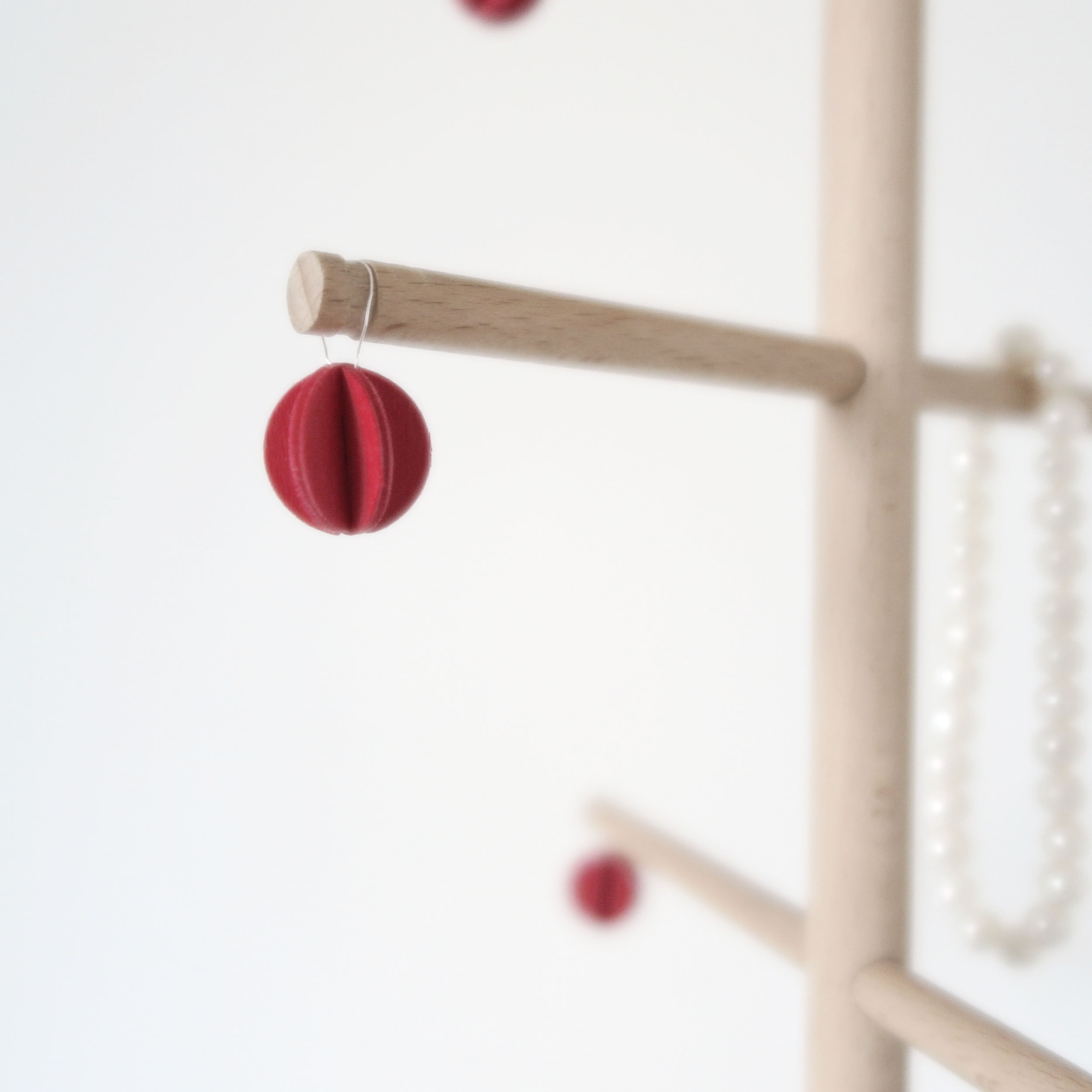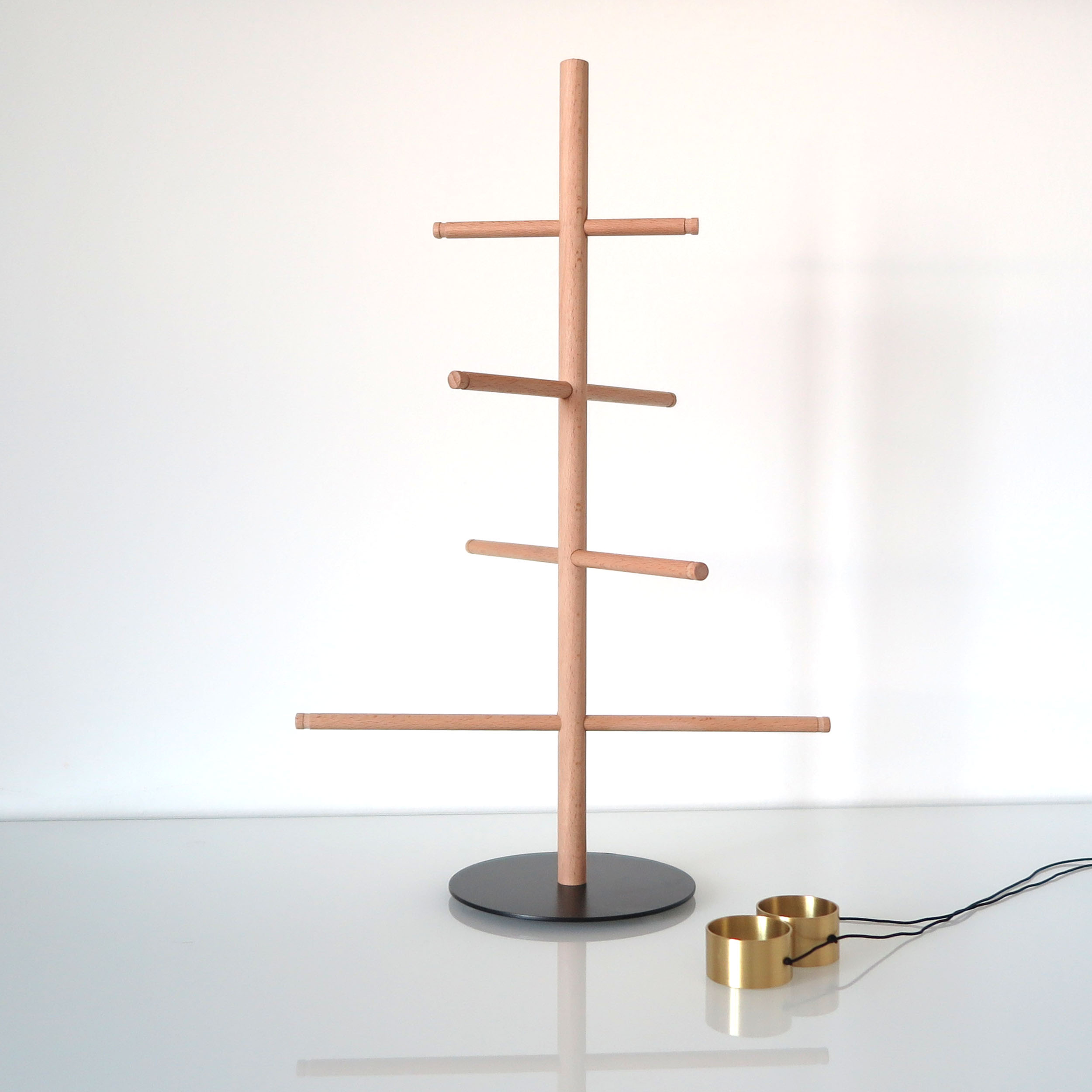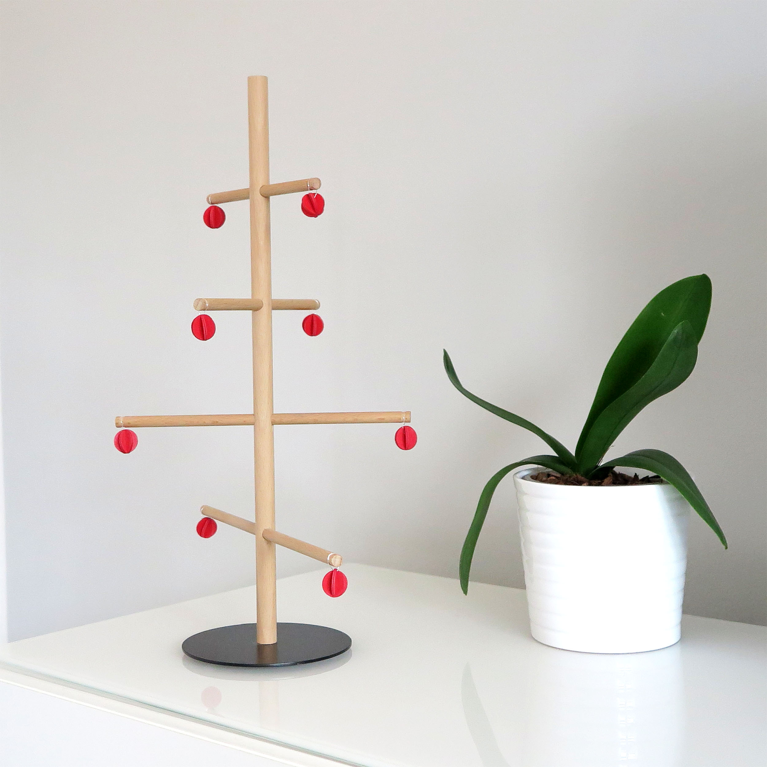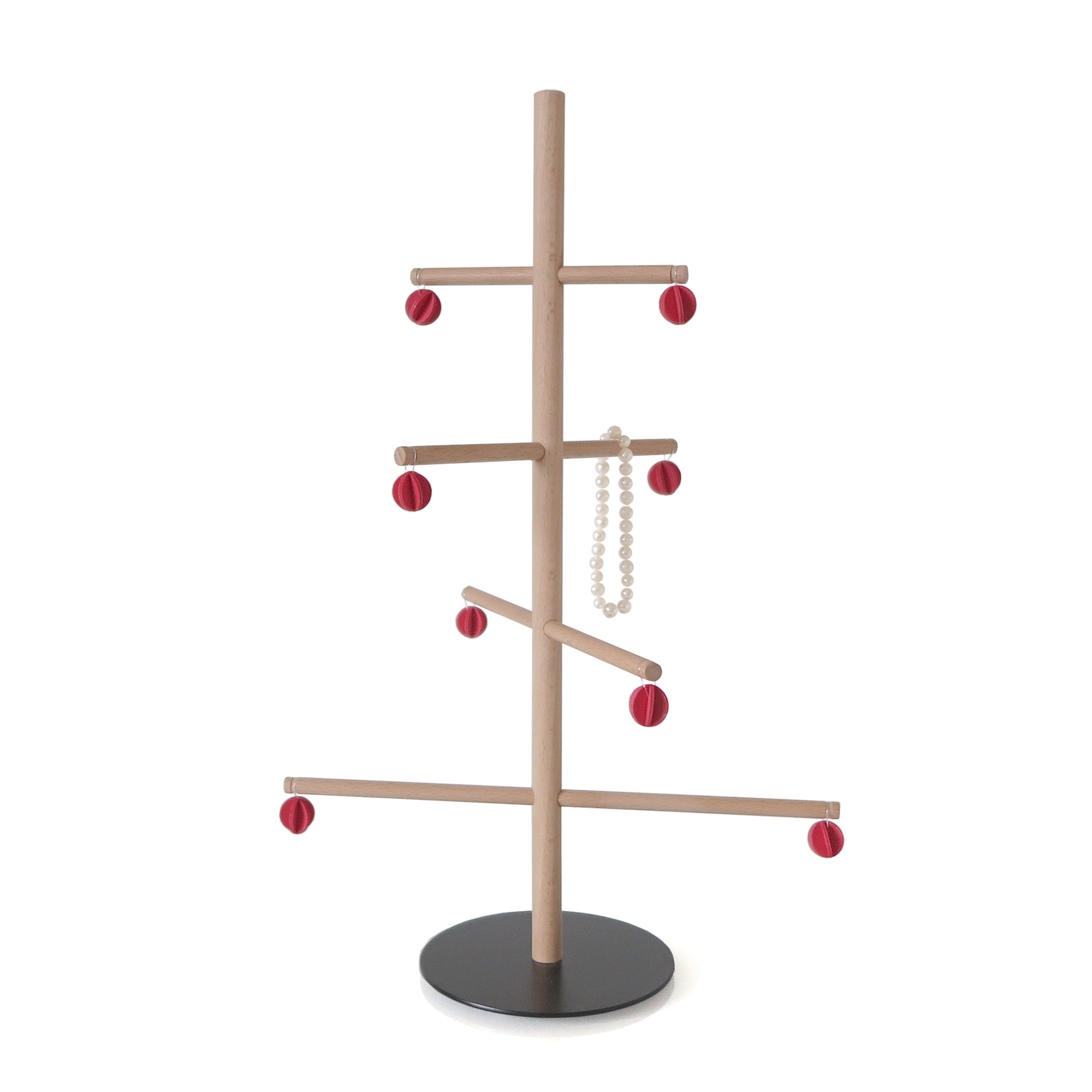 Questo albero di Natale da tavolo è allo stesso tempo un addobbo natalizio ed un funzionale portagioielli, ed è dotato di piccole decorazioni rosse in legno dipinte a mano. E' realizzato completamente a mano in legno di faggio lavorato al tornio, mentre la base in metallo nero opaco gli dona stabilità anche grazie agli inserti in silicone antiscivolo collocati sotto di essa. L'effetto decorativo è originale e minimalista, e non passerà inosservato. Utilizzalo come portagioie nella camera da letto, oppure semplicemente per decorare i tuoi ambienti per il Natale in maniera non convenzionale. Oppure regalalo, per una sospresa con effetto WOW. Si tratta di un prodotto artigianale ed è pensato per essere un pezzo unico dal design intramontabile: vanne fiero!