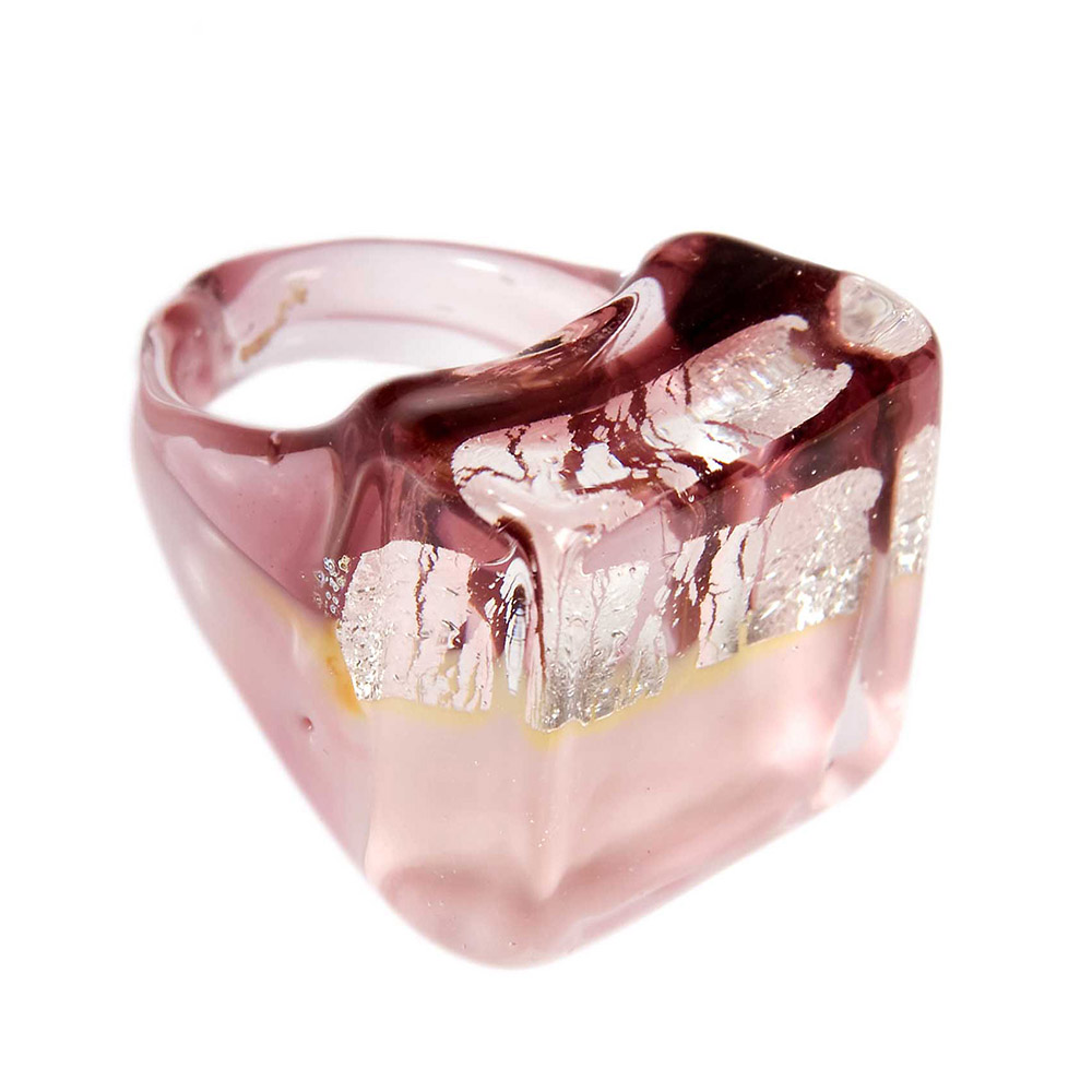 Anello quadrato rosa in vetro di Murano originale e foglia argento PR Lampwork fatto a mano | E-Italy | 100% Made in Italy