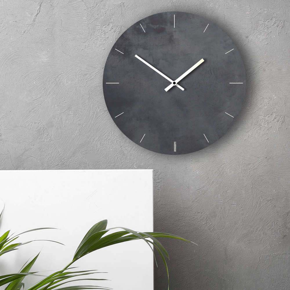 L’orologio da parete Classic di dESIGNoBJECT è un pezzo di design dallo stile sobrio, elegante e raffinato, ma assolutamente non banale, che si inserirà perfettamente in ogni tipo di arredamento. Le sue misure generose permettono una facile letura dell’ora persino da lontano, anche grazie alle lancette bianche satinate che si stagliano sul quadrante color grigio scuro. Il movimento dell’orologio è della ditta tedesca Junghans, che garantisce affidabilità e silenziosità. Questo orologio da muro è realizzato artigianalmente in lamiera in ferro calamina, tagliata a laser e serigrafata rigorosamente a mano. Il ferro calamina è un materiale ricercato e non convenzionale, che presenta sulla superficie irregolarità, tracce e fiammature che danno un tocco unico e vissuto all’oggetto. La superficie è protetta da un sottile strato di cera naturale che va riapplicata per preservare l’orologio nel tempo. Come ogni oggetto di dESIGNoBJECT, anche questo orologio è frutto di lavorazioni artigianali che rendono ogni pezzo unico ed originale.