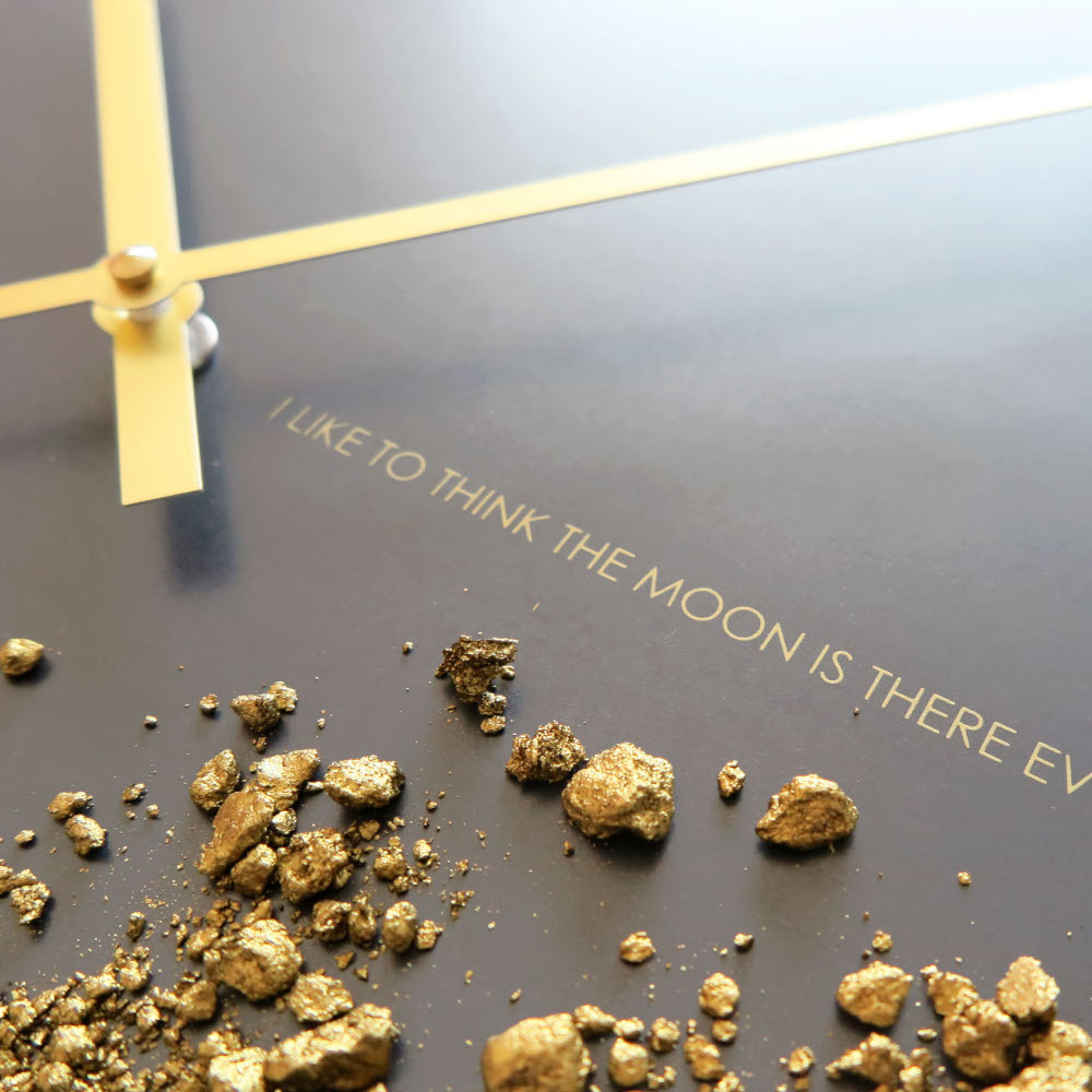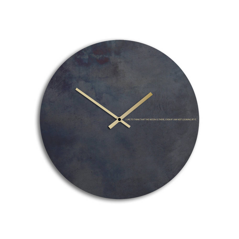 E’ la luna la vera protagonista di questo meraviglioso orologio da parete Black Moon, realizzato in acciaio nero calamina, ed impreziosito da una scritta serigrafata a mano con vera polvere d’oro: “mi piace pensare che sia lì, anche se non la guardo” disse il geniale Albert Einstein a proposito del nostro satellite. Le lunghe lancette color oro contribuiscono all’allure sofisticata e chic di questo complemento d’arredo, che da solo saprà cambiare l’aspetto della vostra parete. Il movimento al quarzo è della ditta tedesca Junghans, che garantisce affidabilità e silenziosità. Il ferro calamina è un materiale ricercato e non convenzionale, che presenta sulla superficie irregolarità, tracce e fiammature che danno un tocco unico e vissuto all’oggetto. La superficie è protetta da un sottile strato di cera naturale che va riapplicata per preservare l’orologio nel tempo. Come ogni oggetto di dESIGNoBJECT, anche questo orologio è frutto di lavorazioni artigianali che rendono ogni pezzo unico ed originale. Sceglietelo per un amico particolarmente chic, o per dare un tocco di stile al vostro arredamento: farete un figurone!