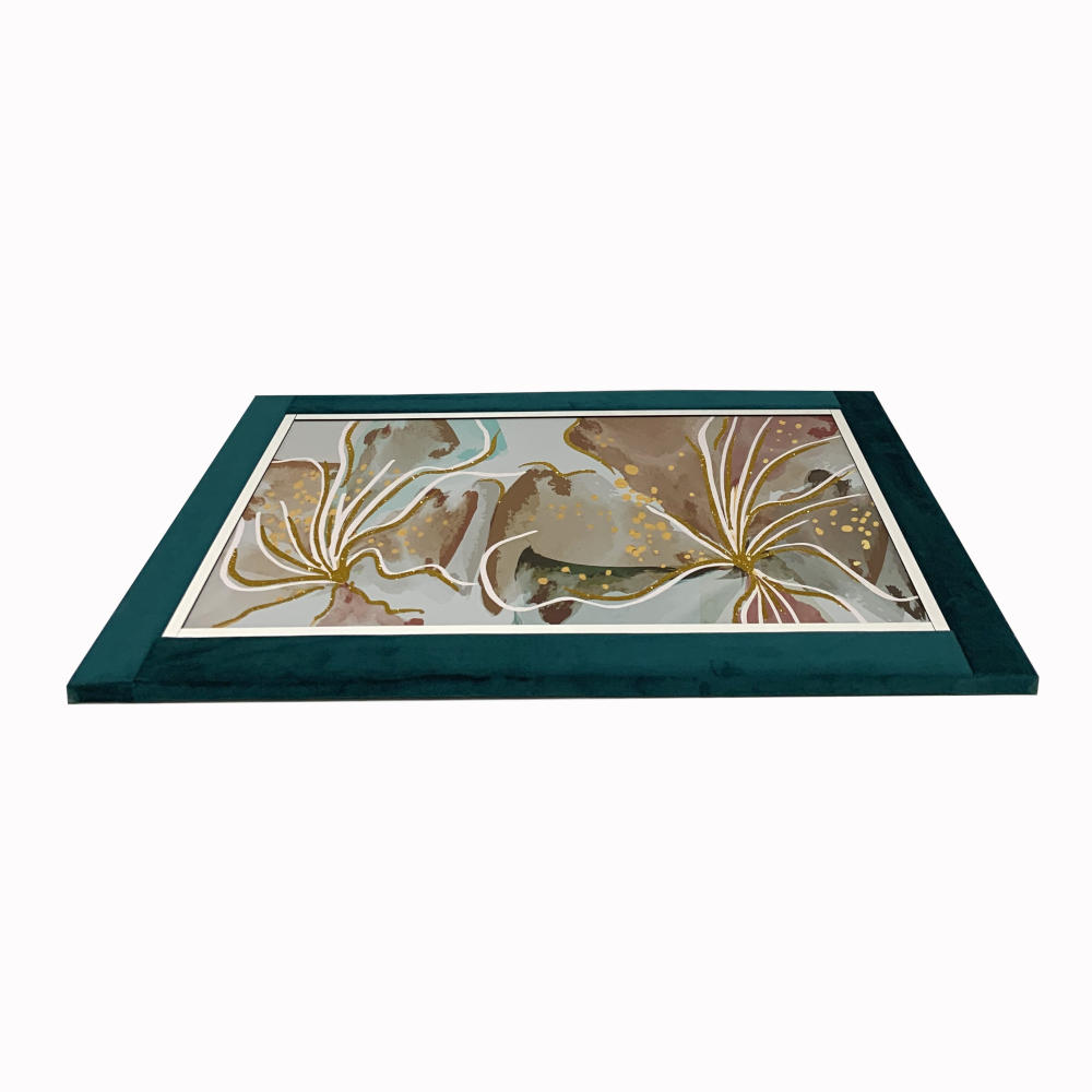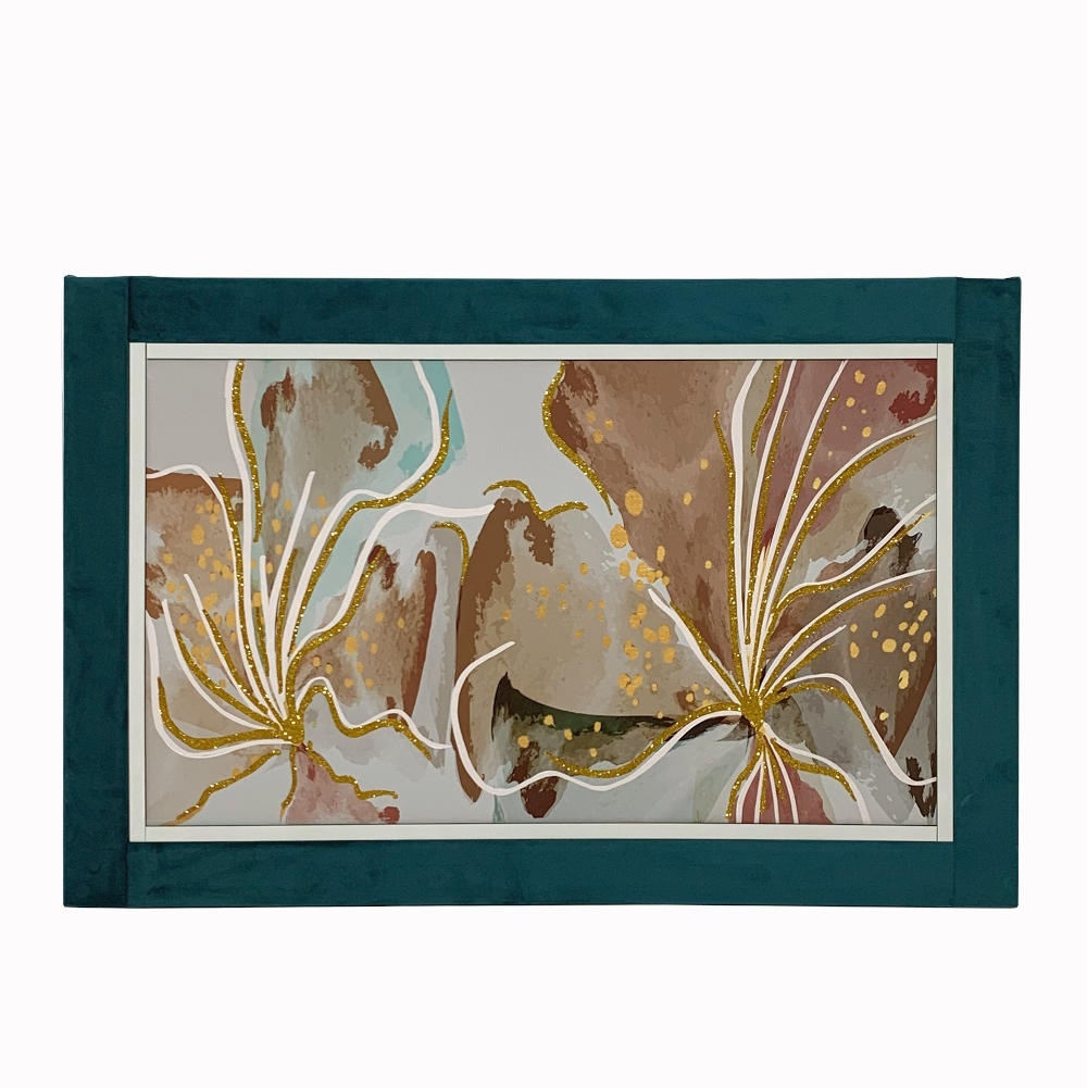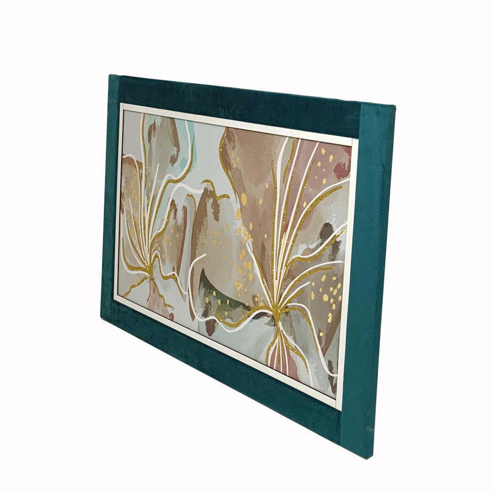 Quadro Nara su canvas disegno floreale rosato e glitter oro con cornice in velluto color petrolio 60x90 cm