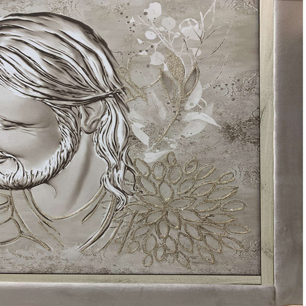 Quadro Nara su canvas capezzale sacra famiglia con glitter champagne e cornice in velluto color khaki 60x90 cm