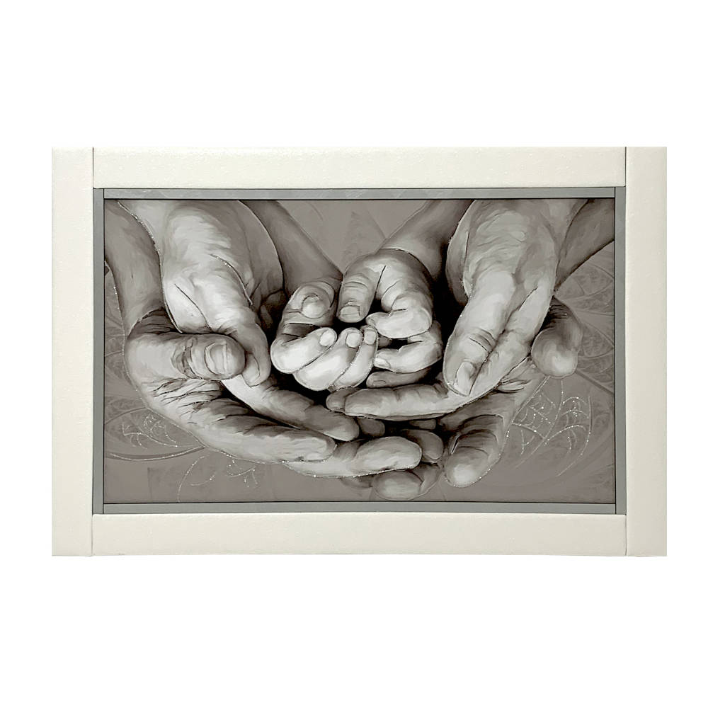 Quadro con disegno mani con glitter argento e cornice in ecopelle bianca 60x90 | E-Italy | 100% Made in Italy