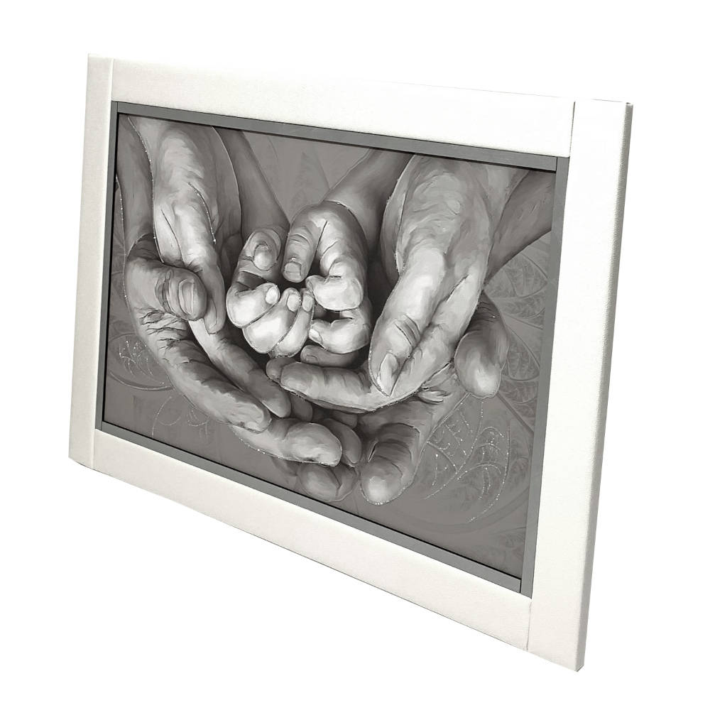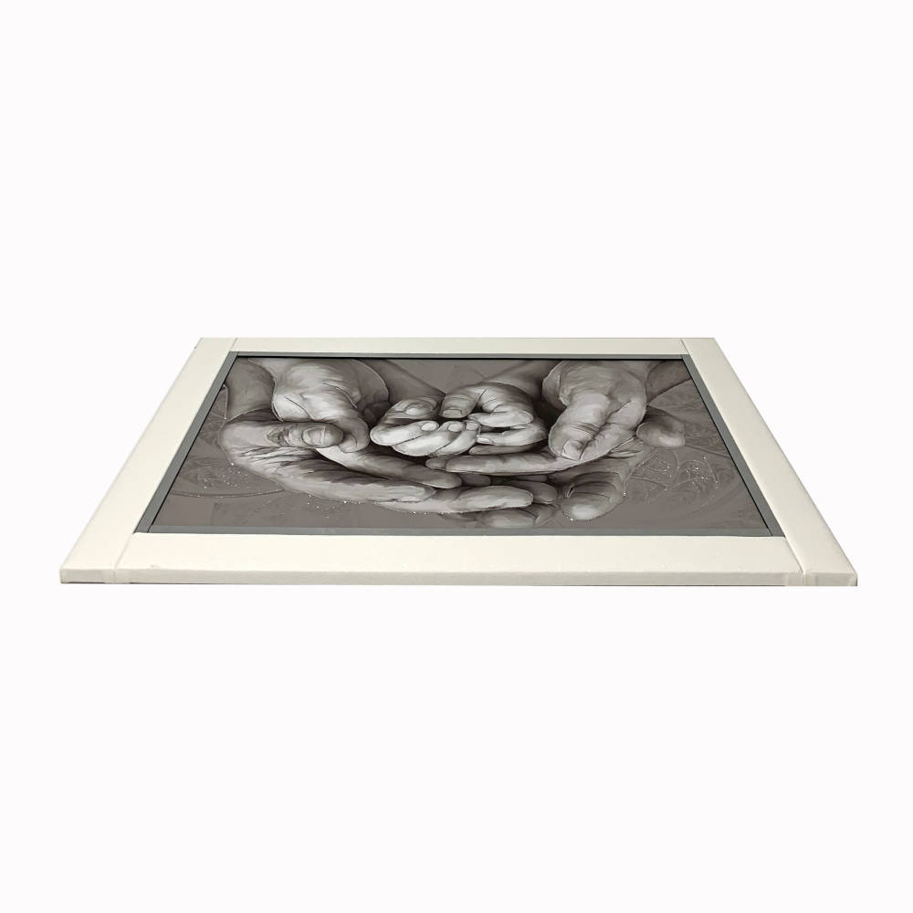 Quadro con disegno mani con glitter argento e cornice in ecopelle bianca 60x90 | E-Italy | 100% Made in Italy