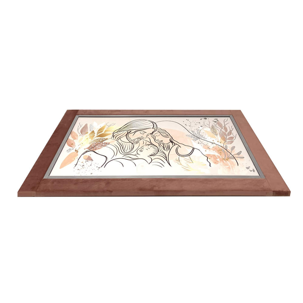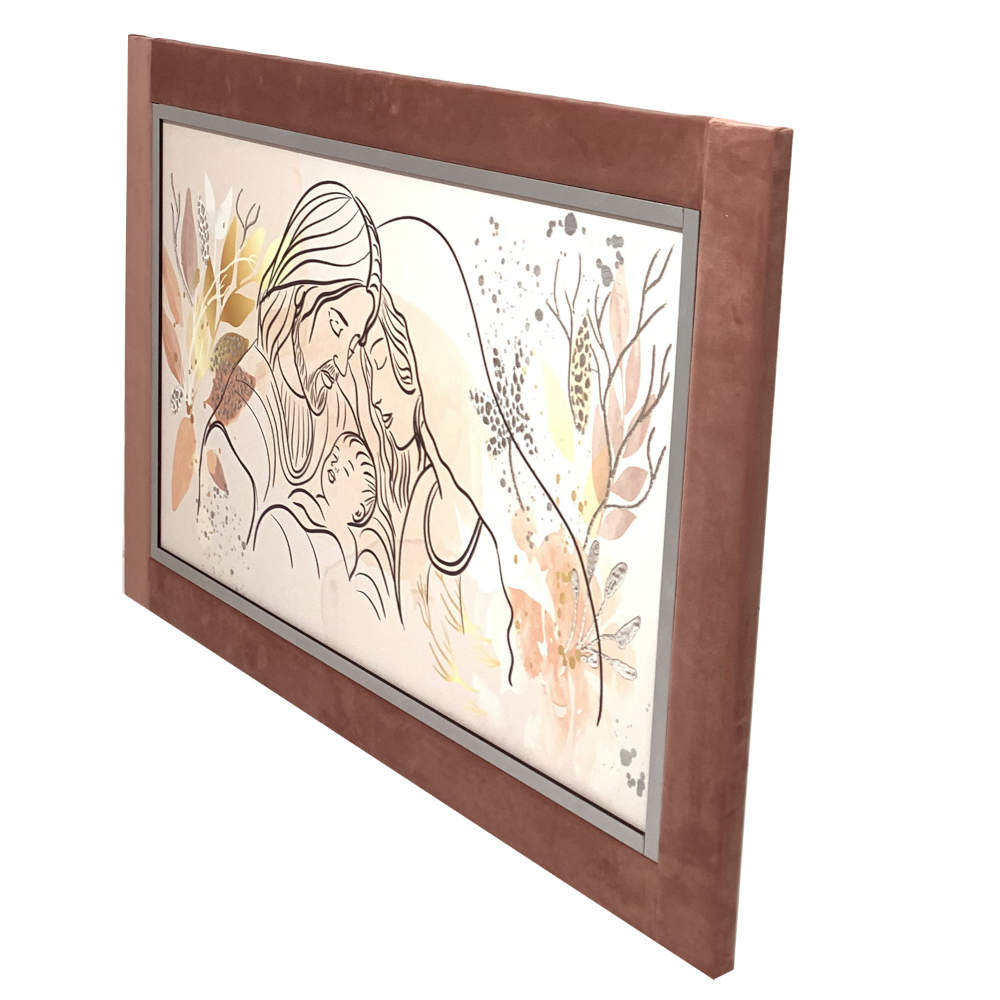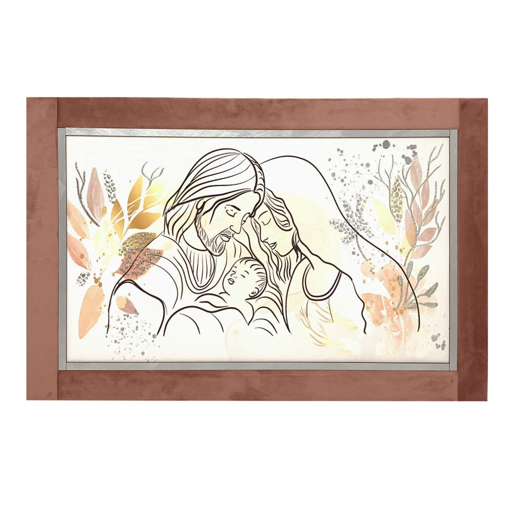 Quadro capezzale sacra famiglia con foglia argento e cornice in velluto color salmone 60x90 | E-Italy | 100% Made in Italy
