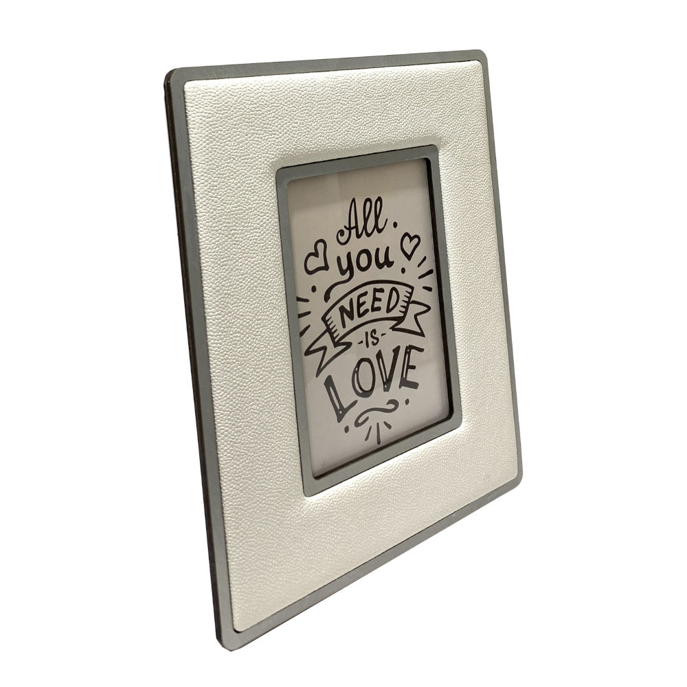 Portafoto rivestito in ecopelle colore bianco con particolari in legno argento | E-Italy | 100% Made in Italy