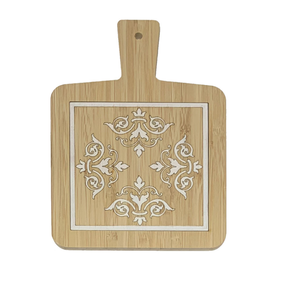 Tagliere in bamboo decorato a mano con motivo damascato di colore bianco made in Italy