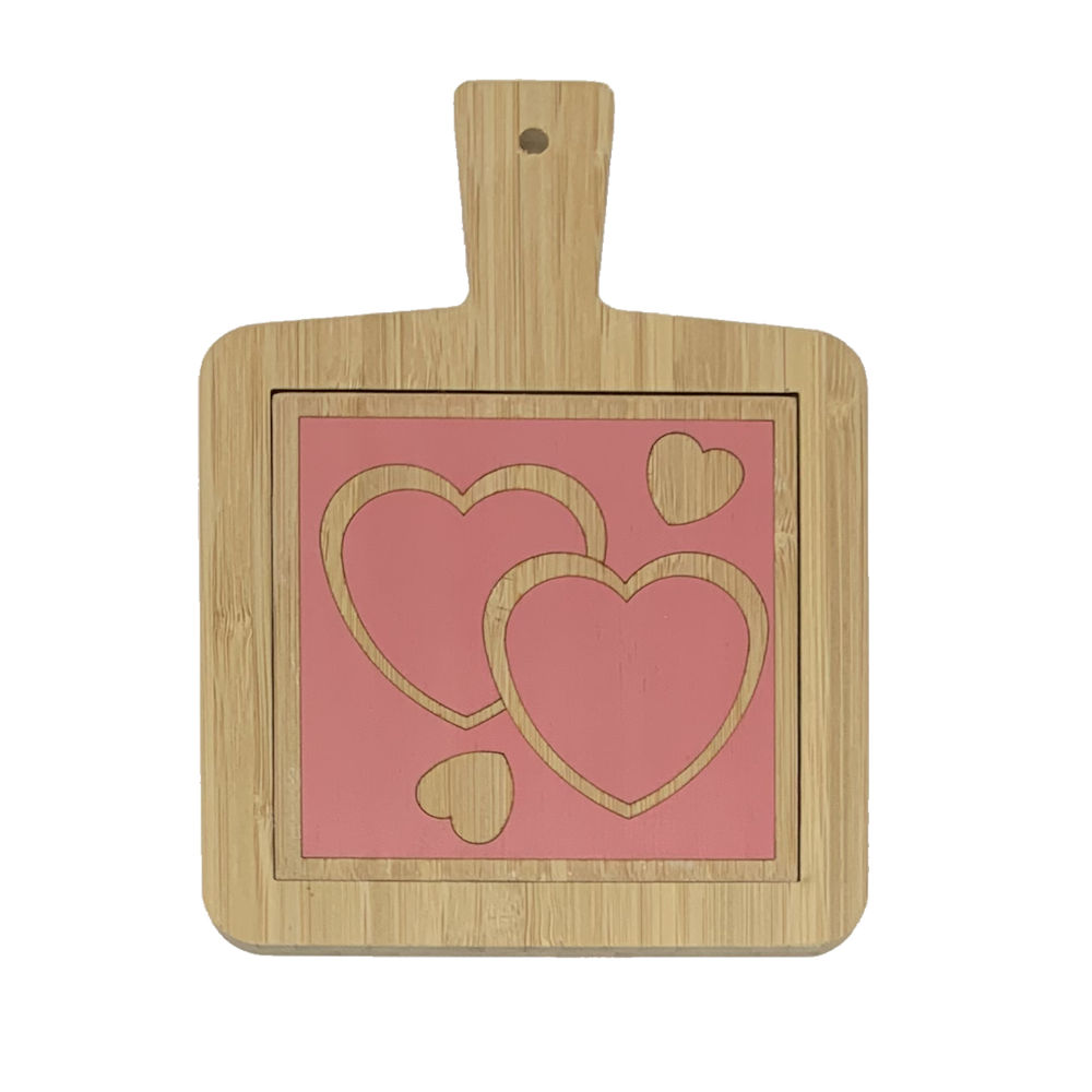 Tagliere in bamboo decorato a mano con motivo a cuori su fondo rosa | E-Italy | 100% Made in Italy