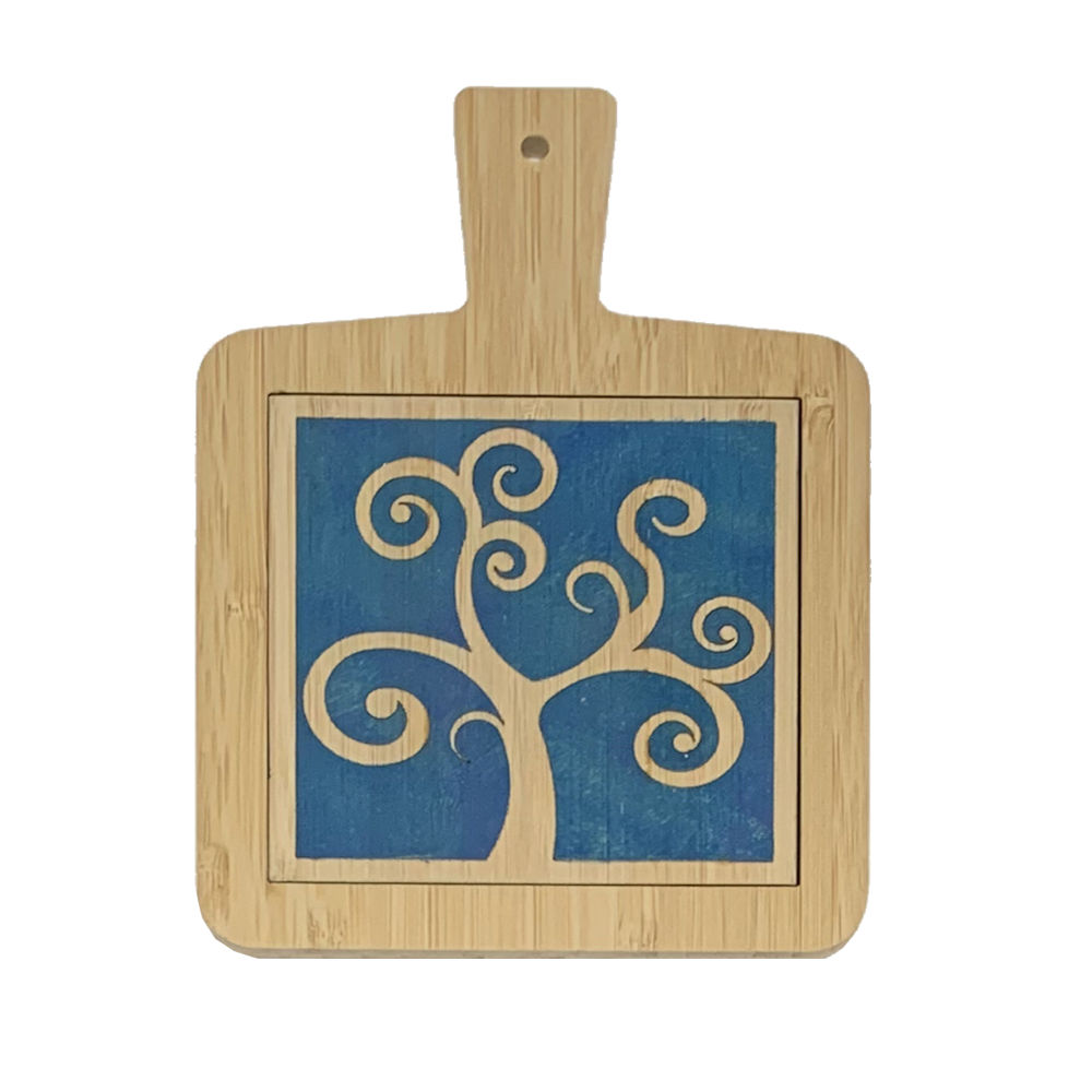 Tagliere in bamboo decorato a mano con motivo albero della vita su fondo blu made in Italy
