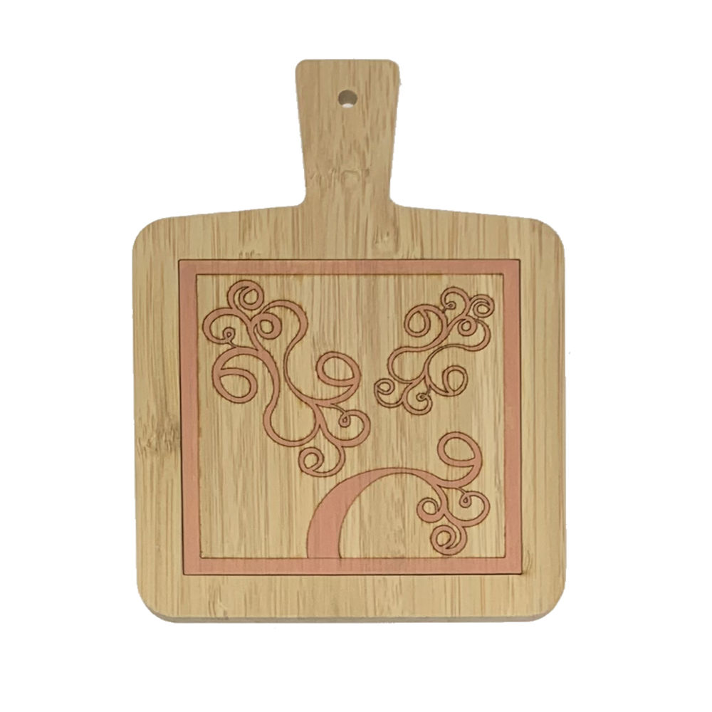 Tagliere in bamboo decorato a mano con motivo a volute color rosa made in Italy